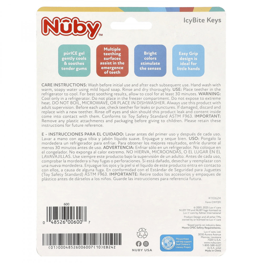Прорезыватель зубов IcyBite Keys от Nuby - это еще одно нововведение в естественном процессе прорезывания зубов. игрушка, которая сочетает в себе упражнения для рук, десен и зубов, а также обеспечивает зрительную стимуляцию вашего ребенка. Эта красочная игрушка также является прорезывателем для зубов с двойной поверхностью. Наконечники Nuby изготовлены из мягкого текстурированного материала со смещенными поверхностями, которые способствуют прорезыванию зубов через нежные десны младенцев. Прохладная упругая нижняя часть "ключей" успокаивает и безопасно стимулирует болезненные десны. Разноцветные конфеты легко держится в руках, а их размер обеспечивает максимальную эффективность как прорезыватели для зубов и соски.