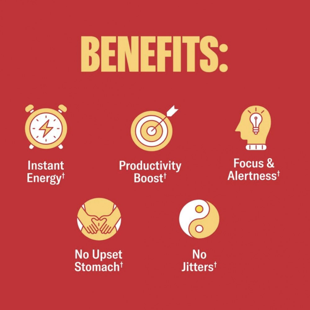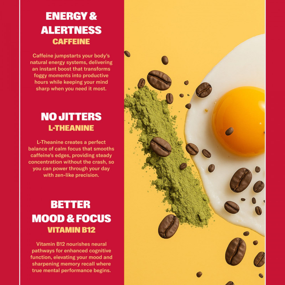 Смесь кофеина, витамина B12 и L-теанина для быстрого стимулирования тела и ума без нервозности.
