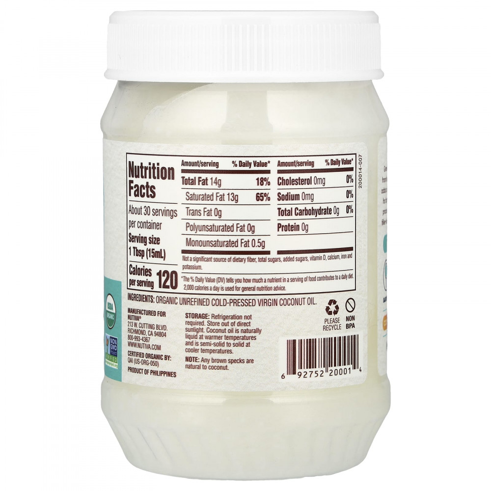 Хранение: Не требует хранения в холодильнике. Беречь от воздействия прямых солнечных лучей. Кокосовое масло естественным образом находится в жидкой форме при более высоких температурах и из полутвердого в твердое при более низких температурах.