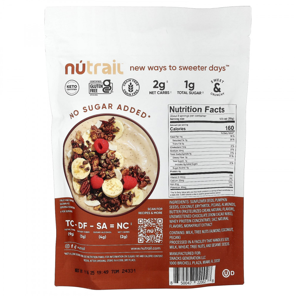 Это для наших любителей шоколада! Как всегда, с низким содержанием сахара и углеводов - не беспокойтесь. Наша фирменная смесь орехов и семян в сочетании с несладким шоколадом и натуральными сладкими монашескими фруктами. Идеальная пара для вашего любимого орехового масла или полезная начинка для вашего любимого десерта - вы действительно не ошибетесь.