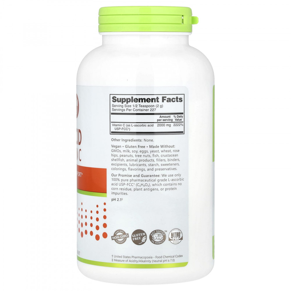 Аскорбиновая кислота NutriBiotic® содержит 100% витамин C (L-аскорбиновую кислоту) фармацевтической степени чистоты в виде хорошо растворимого кристаллического порошка. Витамин C — важное питательное вещество для организма, которое обеспечивает антиоксидантную защиту иммунной системы, а также поддерживает здоровье кровеносных сосудов, тканей, хрящей, костей, глаз и других систем органов. Кроме того, он необходим для биосинтеза коллагена, L-карнитина и нейромедиаторов. Все это делает витамин C жизненно важным для поддержания здоровья всего организма. Каждая порция аскорбиновой кислоты NutriBiotic содержит 2000 мг витамина С.