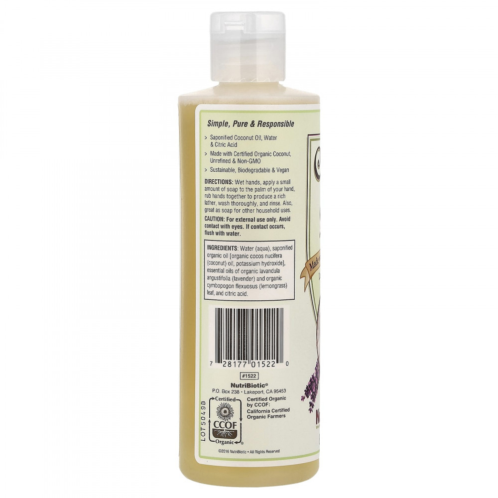 NutriBiotic® Coconut Oil Soap is sourced from sustainable, certified organic coconuts. The coconuts are processed, without chemicals, to extract pure, virgin coconut oil. The coconut oil is then organically saponified with alkali per the National Organic Program, producing a soap of fatty acids and glycerin. This biodegradable soap is blended with citric acid for pH stability and packaged in a protective #2 HDPE container for easy use and recycling. Organic lavender and lemongrass essentials oils are added for a wonderful aroma. NutriBiotic Coconut Oil Soap provides a great cleansing lather.