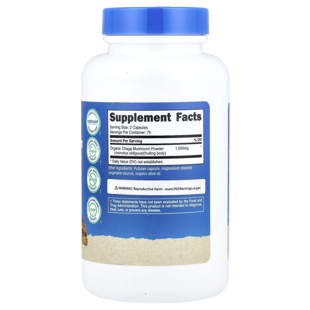 В отличие от многих похожих продуктов Nutricost, гриб чага имеет сертификат CCOF как органический. Ищите сертификат на бутылке. В 1 капсуле по 1000 мг 1 порции содержится 500 мг органического гриба чага. В каждом флаконе 150 вегетарианских капсул — 75 порций. Легко добавьте в свой ежедневный рацион средство, приготовленное из органического гриба чага.