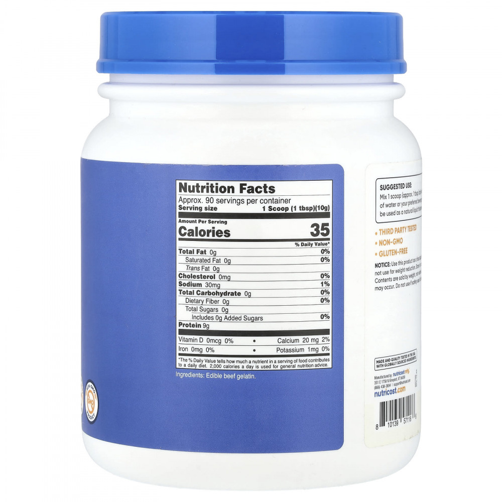 Полезные свойства говяжьего желатина: Порошок из говяжьего желатина от Nutricost - это чистый и натуральный источник желатина, без добавок и консервантов, подходящий для людей, заботящихся о своем здоровье.