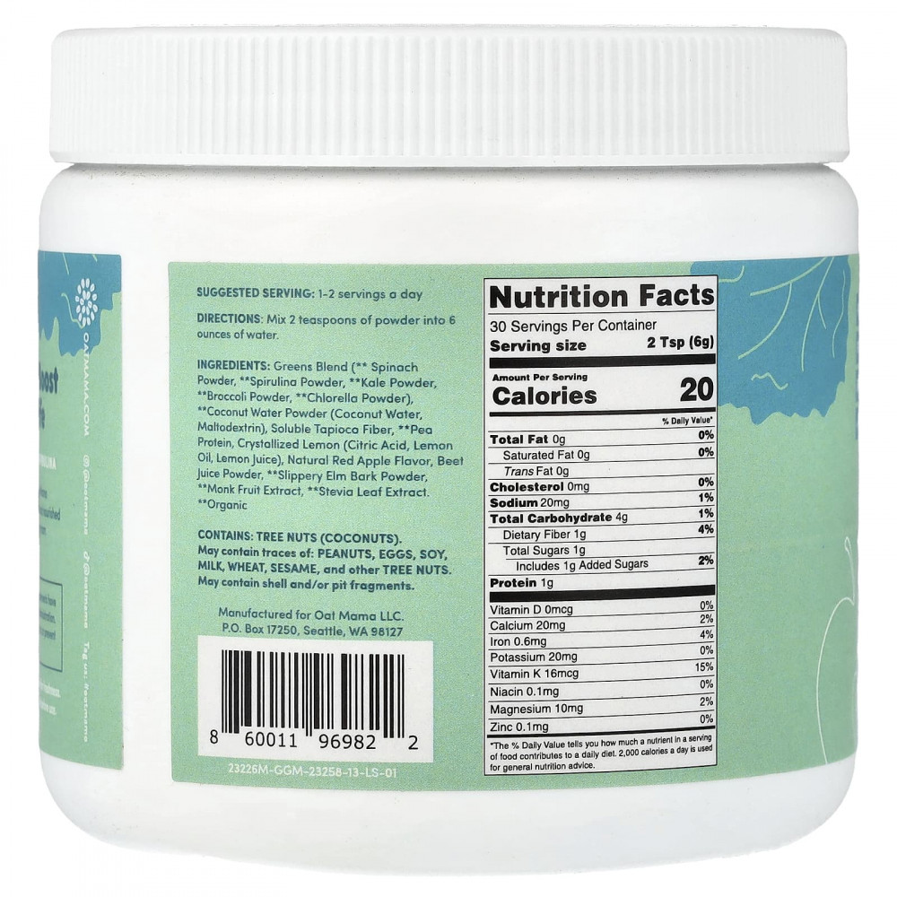 Смесь зелени (** порошок из шпината, ** спирулина в порошке, ** порошок из капусты, ** порошок из брокколи, ** порошок хлореллы) ** порошок из кокосовой воды (кокосовая вода, мальтодекстрин), растворимая тапиоковая клетчатка, ** гороховый протеин, кристаллизованный лимон (лимонная кислота, лимонное масло, лимонный сок), натуральный ароматизатор «красное яблоко», порошок из свекольного сока, ** порошок из коры скользкого вяза, экстракт архата, ** экстракт листьев стевии.