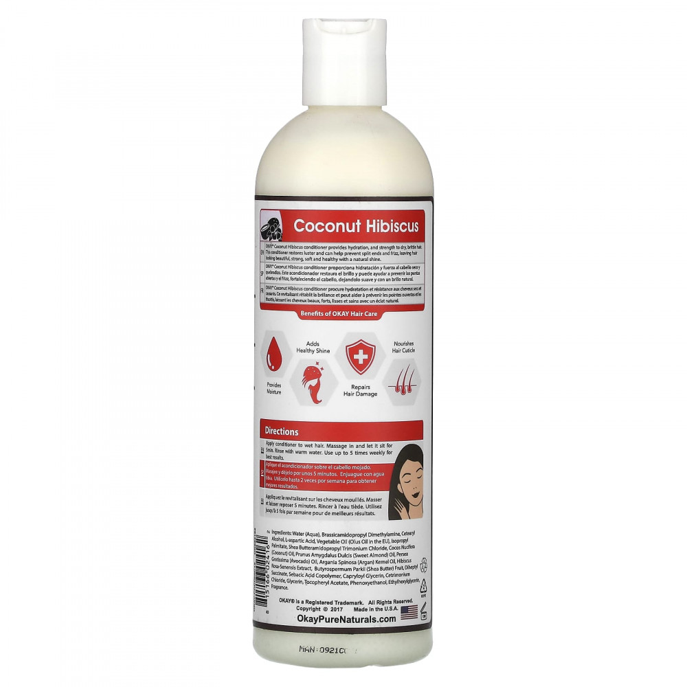 Кондиционер с кокосом и гибискусом Okay® обеспечивает увлажнение и укрепление сухих и ломких волос. Этот кондиционер восстанавливает блеск и помогает предотвратить появление секущихся кончиков волос и пушение, делая волосы красивыми, сильными, мягкими и здоровыми с естественным блеском.