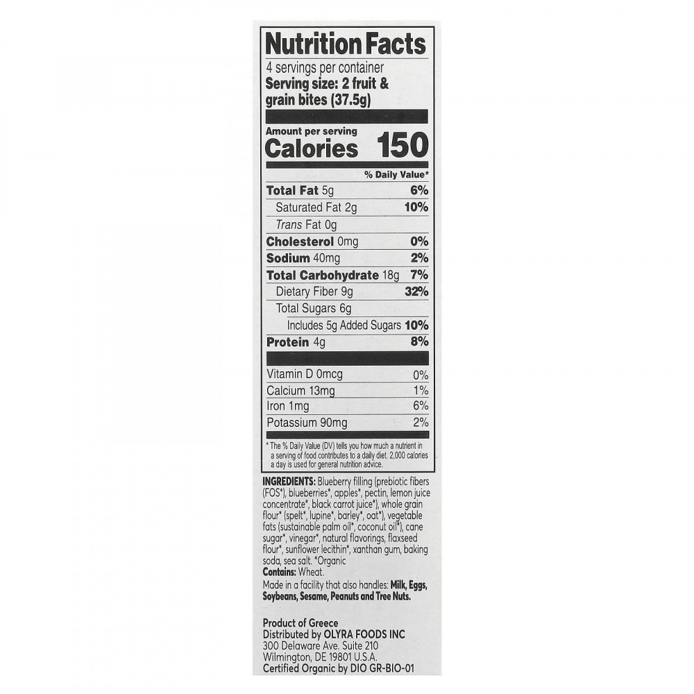 Черничная начинка (пребиотические волокна (ФОС *), голубика *, яблоки*, пектин, концентрат лимонного сока *, сок черной моркови *), цельнозерновая мука * (полба *, люпин *, ячмень *, овес *), растительные жиры (экологически безопасное пальмовое масло *, кокосовое масло *), тростниковый сахар*, уксус *, натуральные ароматизаторы, льняная мука *, подсолнечный лецитин *, ксантановая камедь, пищевая сода, морская соль.