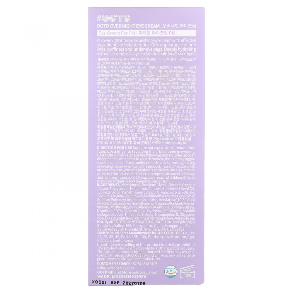 Результаты теста на уменьшение темных кругов под глазами: Протестировано корейским дерматологическим центром на 31 женщине в период с 1 по 21 июля 2021 года. Субъекты применения A: Используйте интенсивную сыворотку для глаз OOTD утром после очищения и наносите витамины B: Ночной крем для области вокруг глаз. Рекомендуется использовать в течение 4 недель.