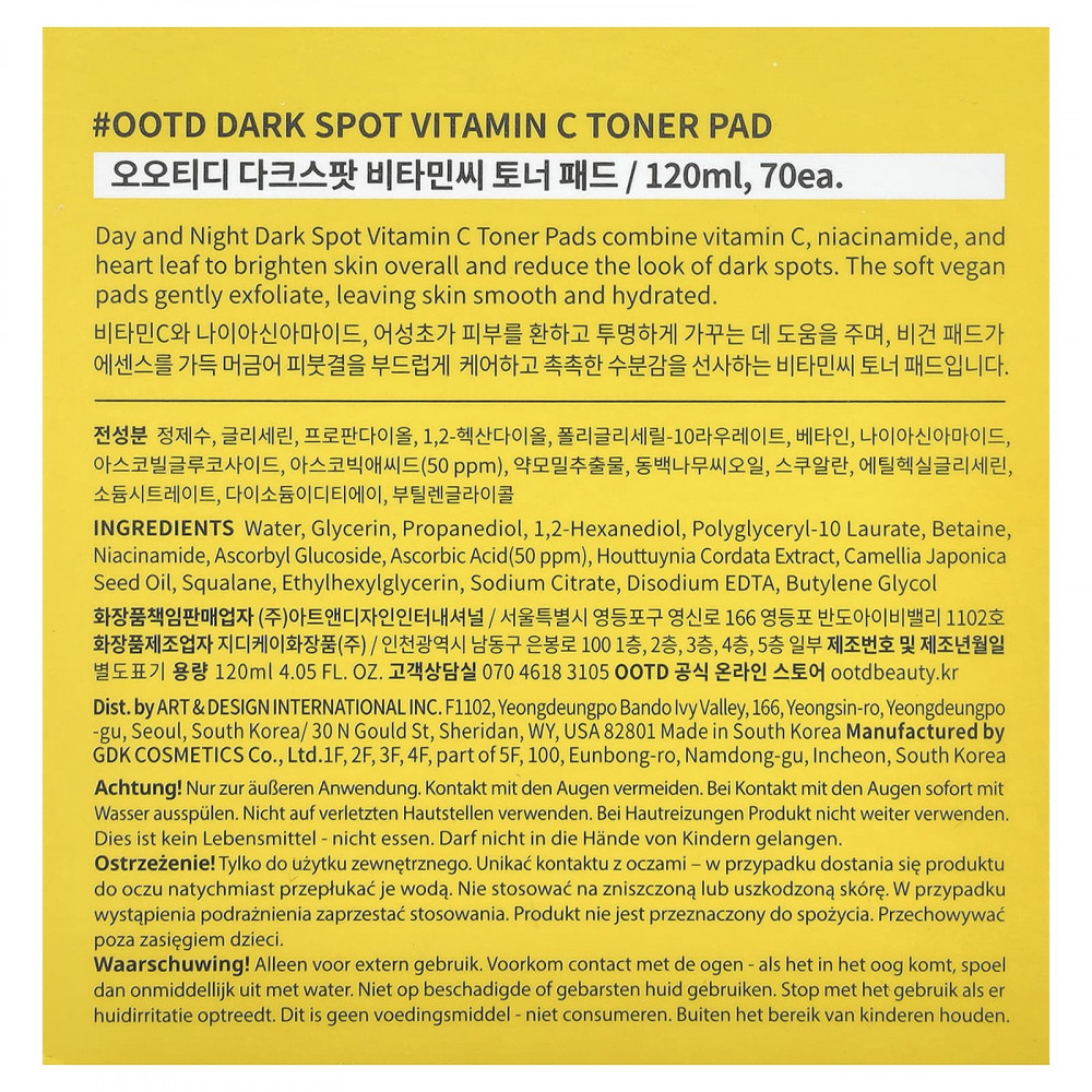 Дневные и ночные прокладки с тоником и витамином C от темных пятен содержат витамин C, ниацинамид и сердцевину, чтобы осветлить кожу в целом и уменьшить видимость пигментных пятен. Мягкие веганские подушечки нежно отшелушивают, делая кожу гладкой и увлажненной.