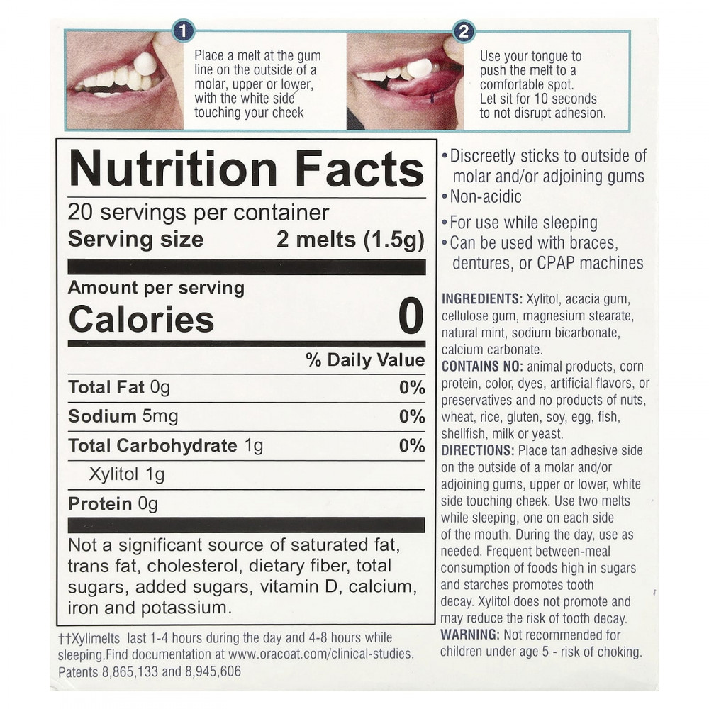 XyliMelts — это диски, которые прилипают к зубам или деснам и облегчают постоянную сухость во рту. Используйте XyliMelts в течение дня или во время сна и временно избавьтесь от частой жажды, липкой сухости во рту и горле, а также других неприятных симптомов сухости во рту. Содержит ксилитол, натуральный подсластитель, который помогает стимулировать слюнообразование, в средстве XyliMelts используется технология прилипающих дисков для медленного высвобождения 550 мг ксилитола, который наиболее эффективен при постоянном высвобождении и удерживании во рту, особенно при использовании во время сна, когда выделение слюны минимально. XyliMelts действует в течение нескольких часов, увлажняя и покрывая полость рта, обеспечивая оптимальный комфорт. Мягкий мятный вкус освежает дыхание, а ксилитол может снизить риск разрушения зубов.