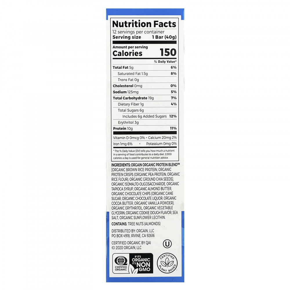 Органическая протеиновая смесь Orgain ™ [протеин из органического коричневого риса, органические протеиновые чипсы (органический гороховый протеин, органическая рисовая мука), органические молотые семена чиа], органический изомальтоолигосахарид, органический тапиоковый сироп, органическая миндальная паста, органическая шоколадная крошка (органический тростниковый сахар, органический шоколадный ликер, органическое какао-масло, органический ванильный порошок), органический эритритол, органический растительный глицерин, органический ароматизатор для печенья, морская соль, органический подсолнечный лецитин.