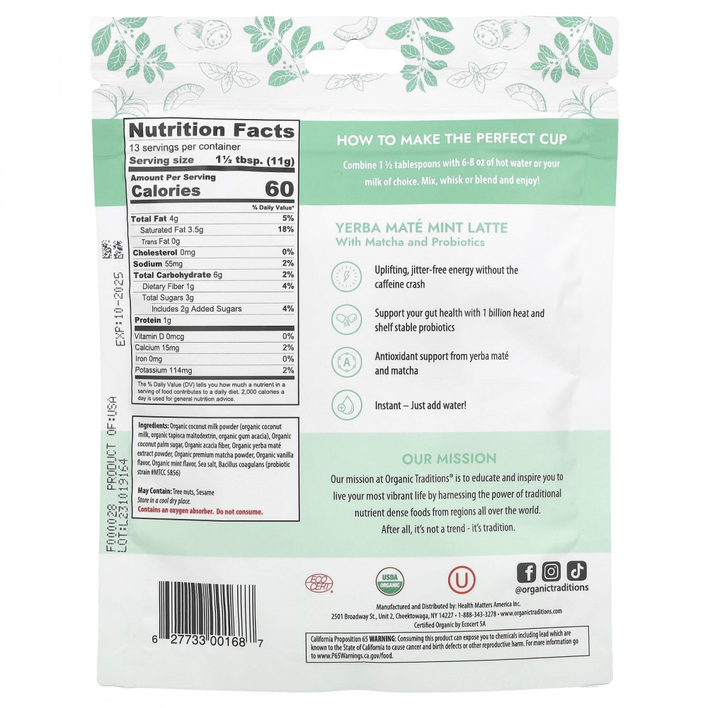 Органическое сухое кокосовое молоко (органическое кокосовое молоко, органический мальтодекстрин из тапиоки, органическая аравийская камедь), органический кокосовый сахар, клетчатка из органической акации, порошок из экстракта органического йерба мате, органический порошок матча премиального качества, органический ароматизатор «Ваниль», органический ароматизатор «Мята», морская соль, бактерии бациллус коагуланс (Bacillus coagulans) (штамм пробиотика #mtcc 5856).