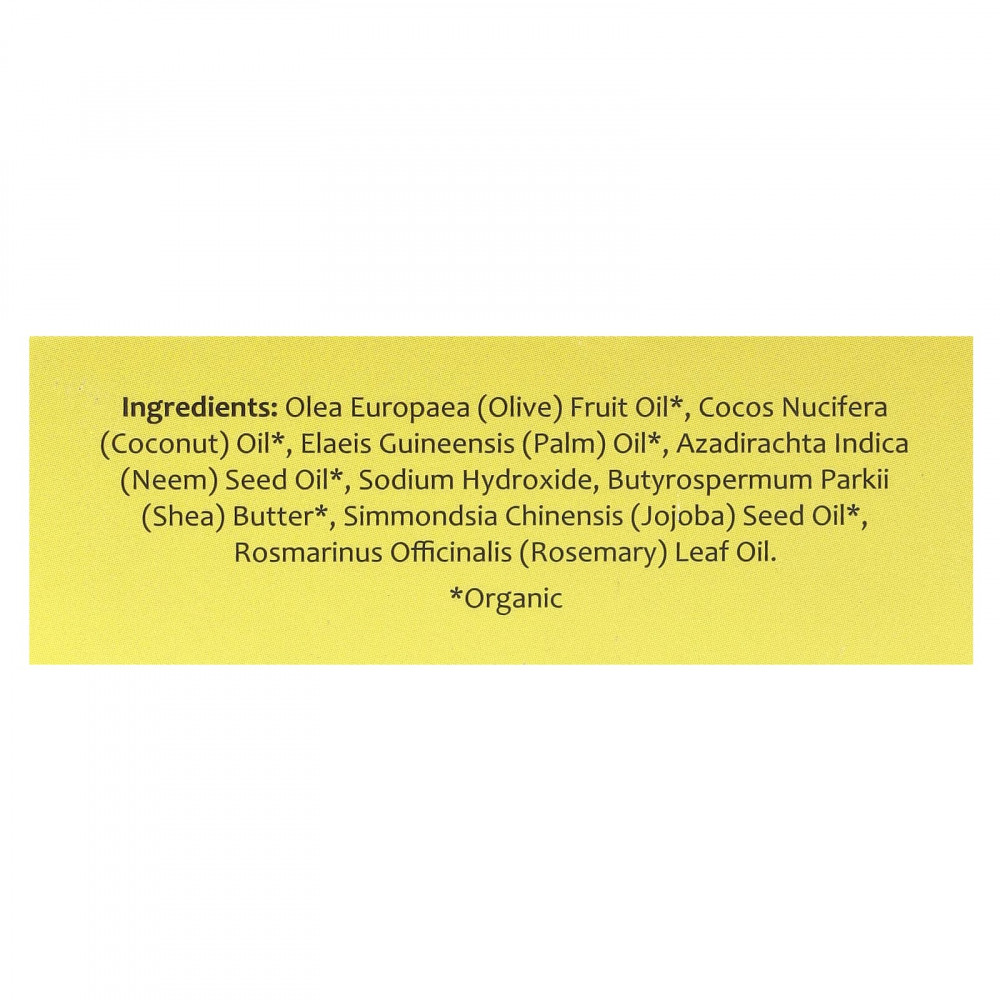Оливковое масло (Olea europaea)*, кокосовое масло (Cocos nucifera)*, пальмовое масло (Elaeis guineensis)*, масло семян нима (Azadirachta indica)*, гидроксид натрия, масло ши (Butyrospermum parkii)*, масло семян жожоба (Simmondsia chinensis)*, масло из листьев розмарина (Rosmarinus officinalis).