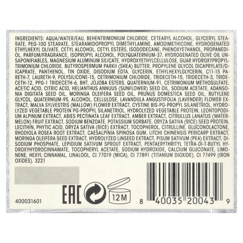 Вода, бегентримония хлорид, цетеариловый спирт, глицерил стеарат, ПЭГ-100 стеарат, стеарамидопропил диметиламин, амодиметикон, гидрогенизированный этилгексил оливат, цетиловый спирт, цетиловые эфиры, изододекан, феноксиэтанол, пропандиол, парфюмерная композиция/отдушка, изопропиловый спирт, поликватерниум-37, неомыляемые вещества гидрогенизированного оливкового масла, алюмосиликат магния, гидроксиэтилцеллюлоза, гуар гидроксипропилтримония хлорид, масло ши (Butyrospermum parkii), пропиленгликоль дикаприлат/дикапрат, пантенол, оксид олова, двунатриевая ЭДТК, глицерин, этилгексилглицерин, c11-15 парет-7, лаурет-9, полисиликон-15, цетримония хлорид, тридецет-15, тридецет-3, тридецет-12, ППГ-1 тридецет-6, бутилгидрокситолуол, эфиры жожоба, кватерниум-91, цетримония метосульфат, уксусная кислота, лимонная кислота, подсолнечное масло (Helianthus annuus), ацетат натрия, масло из семян баобаба (Adansonia digitata), масло из семян моринги масличной (Moringa oleifera), масло из сливовых косточек (Prunus domestica), бутиленгликоль, кватерний-95, спирт, целлюлоза, экстракт цветков лаванды (Lavandula angustifolia), экстракт цветков мальвы (Malva sylvestris), цистин бис-ПГ-пропил силантриол, гидролизованный растительный белок ПГ-пропил силантриол, гидролизированный растительный протеин, экстракт эдельвейса альпийского (Leontopodium alpinum), экстракт листьев падуба гребенчатого (Abies pectinata), экстракт янтаря, экстракт арбуза (Citrullus lanatus), бензоат натрия, сорбат калия, протеин из семян риса (Oryza sativa), лецитин, фитиновая кислота, экстракт риса (Oryza sativa), токоферол, цитруллин, глюконолактон, экстракт корня родиолы розовой (Rhodiola rosea), камедь тары (Caesalpinia spinosa), экстракт околоплодника личи китайского (Litchi chinensis), экстракт семян моринги (Moringa oleifera), гидролизованный экстракт семян льна, экстракт гороха (Pisum sativum), динатрия фосфат, экстракт стебля кресс-салата (Lepidium sativum), пентаэритритил тетра-ди-трет-бутил гидроксигидроциннамат, токоферилацетат, гидроксид натрия, глюконат кальция, лимонен, гексил циннамал, линалоол, слюда (CI 77019), диоксид титана (CI 77891), оксиды железа (CI 77499).