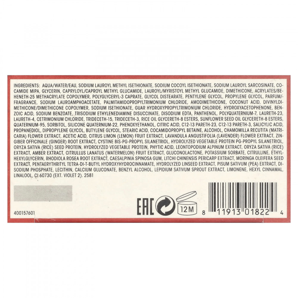 Вода, натрия лауроил метил изетионат, кокоил изетионат натрия, лауроилсаркозинат натрия, кокамид моноизопропаноламина, глицерин, каприлоил/капроил метил глюкамид, лаурил/миристоил метил глюкамид, диметикон, сополимер акрилатов/бегенет-25 метакрилата, полиглицерил-3 капрат, гликоль дистеарат, пентилен гликоль, пропиленгликоль, парфюмерная композиция, лауроамфоацетат натрия, пальмитамидопропилтримония хлорид, амодиметикон, кокосовая кислота, дивинилдиметикон/диметикон сополимер, изетионат натрия, гуар гидроксипропилтримония хлорид, гидроксиацетофенон, бензойной кислоты, бензоат натрия, тринатрия этилендиамин дисукцинат, двунатриевая ЭДТК, пантенол, поликватерниум-7, лаурет-23, лаурет-4, цетримония хлорид, тридецет-15, тридецет-3, рисовое масло, 8 эфиры глицерет-8, подсолнечное масло, 8 эфиры глицерет-8, кватерний-95, сорбитол, кватерний-22 из силикона, феноксиэтанол, лимонная кислота, C12-13 парет-23, C12-13 парет-3, салициловая кислота, пропандиол, дипропиленгликоль, бутиленгликоль, стеариновая кислота, кокамидопропилбетаин, спирт, экстракт цветков ромашки лекарственной (Chamomilla recutita), уксусная кислота, экстракт плодов лимона (Citrus limon), экстракт цветков лаванды (Lavandula angustifolia), экстракт корня имбиря (Zingiber officinale), цистин бис-ПГ-пропил силантриол, гидролизованный растительный белок ПГ-пропил силантриол, протеин из семян риса (Oryza sativa), гидролизированный растительный протеин, фитиновая кислота, экстракт эдельвейса альпийского (Leontopodium alpinum), экстракт риса (Oryza sativa), экстракт янтаря, экстракт арбуза (Citrullus lanatus), глюконолактон, сорбат калия, цитруллин, этилгексилглицерин, экстракт корня родиолы розовой (Rhodiola rosea), камедь тары (Caesalpinia spinosa), экстракт околоплодника личи китайского (Litchi chinensis), экстракт семян моринги (Moringa oleifera), пентаэритритил тетра-ди-трет-бутил гидроксигидроциннамат, гидролизованный экстракт семян льна, экстракт гороха (Pisum sativum), динатрия фосфат, лецитин, глюконат кальция, бензиловый спирт, экстракт стебля кресс-салата (Lepidium sativum), лимонен, гексил циннамал, линалоол, краситель фиолетовый 2 (CI 60730).