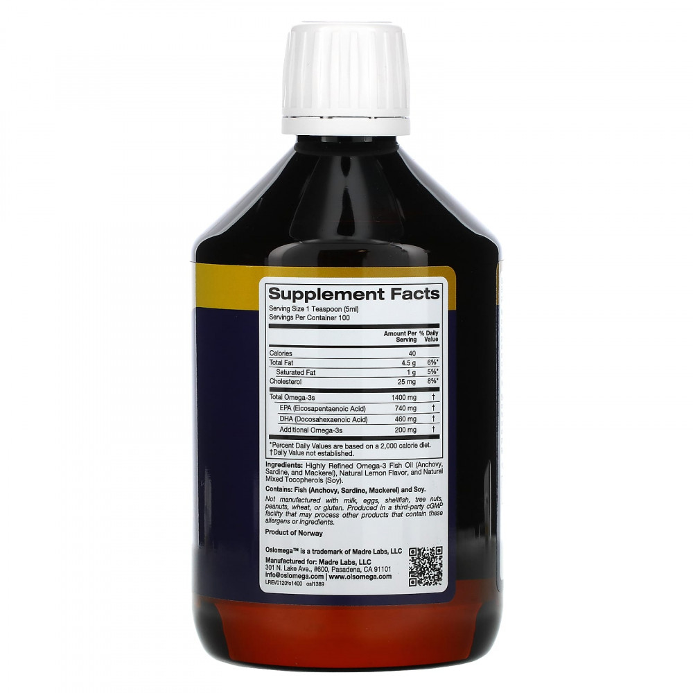 Омега-3 от Oslomega содержит высокоочищенный концентрированный рыбий жир KD-Pür®, обработанный в Норвегии, с натуральным лимонным вкусом. Удобную жидкую добавку легко добавить в свой ежедневный рацион.