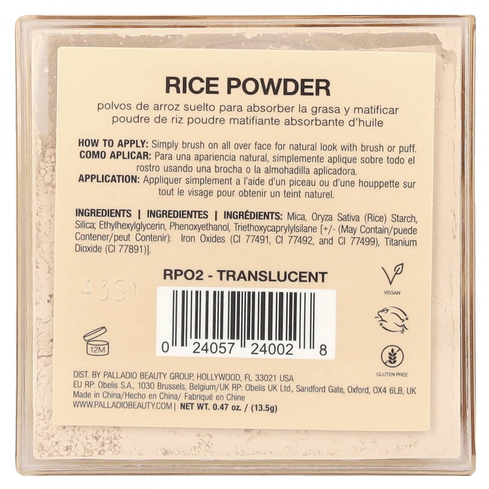 Измените свой рутинный макияж с помощью рисовой пудры Palladio, универсального ингредиента, созданного для улучшения цвета лица благодаря своей невесомой, матирующей формуле. Попрощайтесь с нежелательным блеском и получите мягкий финиш, который легко стирает поры и фиксирует макияж на несколько часов подряд. Эта легкая как перышко формула, созданная из порошка ультратонкого измельченного риса, мгновенно «фильтрует» кожу, обеспечивая стойкий матовый финиш. Готовите ли вы макияж в течение дня или поправляетесь в середине дня, эта впитывающая масло рассыпчатая пудра легко стирает недостатки, обеспечивая стойкость. Плавно впитываясь в кожу, он образует невидимую вуаль, подчеркивающую естественную красоту кожи и контролирующая излишки жира.