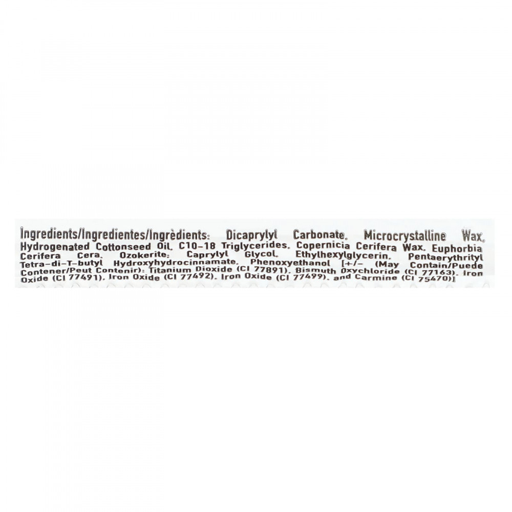 Дикаприлил карбонат, микрокристаллический воск, гидрогенизированное хлопковое масло, c10-18 триглицериды, воск Copernicia cerifera, канделильский воск (Euphorbia cerifera), озокерит: каприлилгликоль, этилгексилглицерин, пентаэритритил тетра-ди-трет-бутил гидроксигидроциннамат, феноксиэтанол [+/- (может содержать): диоксид титана (CI 77891), оксихлорид висмута (CI 77163), железо (CI 77491), оксиды железа (CI 77492), оксид железа (кл. 77499), и кармин (CI 75470)].