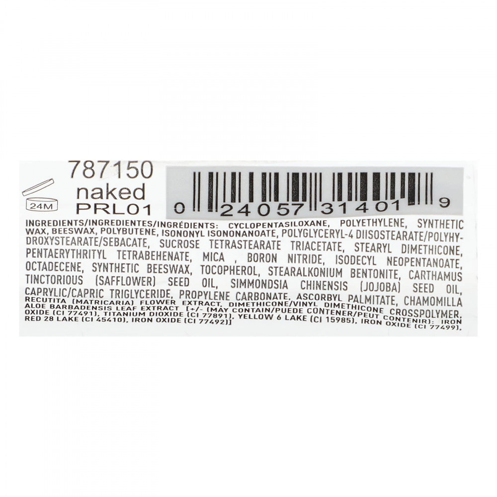 циклопентасилоксан, полиэтилен, синтетический воск, пчелиный воск, полибутен, изононил изононаноат, полиглицерил-4 диизостеарат/полигидроксистеарат/себакат, тетрастеарат триацетат сахарозы, стеарил диметикон, пентаэритритил тетрабегенат, слюда нитрид бора, изодецилнеопентаноат, октадецен, синтетический воск, токоферол, стеаралкония бентонит, масло семян сафлора (Carthamus tinctorius), масло из семян жожоба (Simmondsia chinensis), каприловый/каприновый триглицерид, пропиленкарбонат, аскорбил пальмитат, экстракт цветков ромашки лекарственной (Chamomilla recutita), диметикон/винил диметикон кроссполимер, экстракт листьев алоэ барбаденсис [+/- (может содержать) оксид железа (CI 77491), диоксид титана (CI 77891), желтый 6 лейк (CI 15985), оксид железа (CI 77499). красное дерево 28 лейк (CI 45410), оксид железа (CI 77492)].