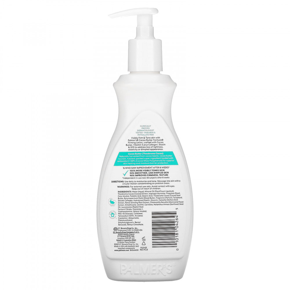 Заметно твердая & Тонизируйте кожу с помощью укрепляющего лосьона Palmer's® Cocoa Butter Formula® на основе масла какао, витамина Е, коллагена и эластина & Q10 для устранения потери герметичности и эластичности, а также для устранения ямок.
