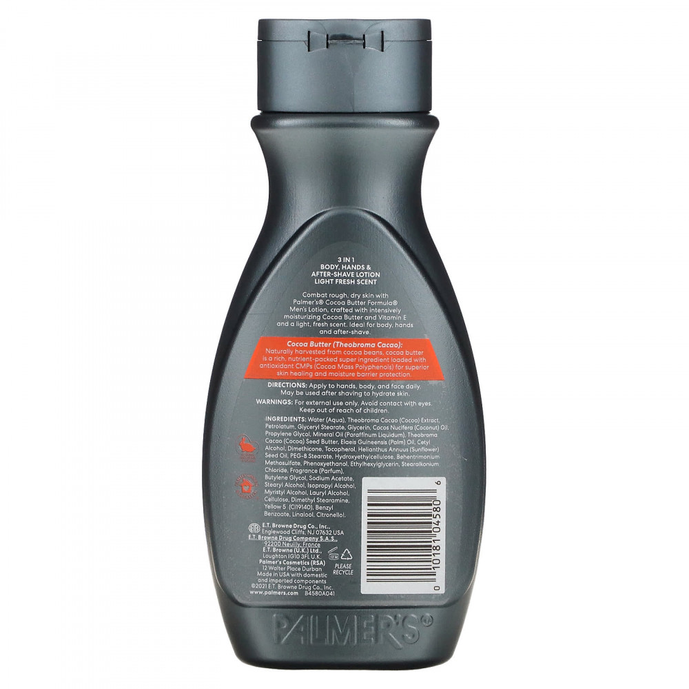 Боритесь с огрубевшей и сухой кожей с помощью мужского лосьона какао-масла Palmer's® Cocoa Butter Formula®, созданного для интенсивного увлажнения какао-масла и витамина Е и обладающего легким освежающим ароматом. Идеально подходит для тела, рук и средств после бритья.
