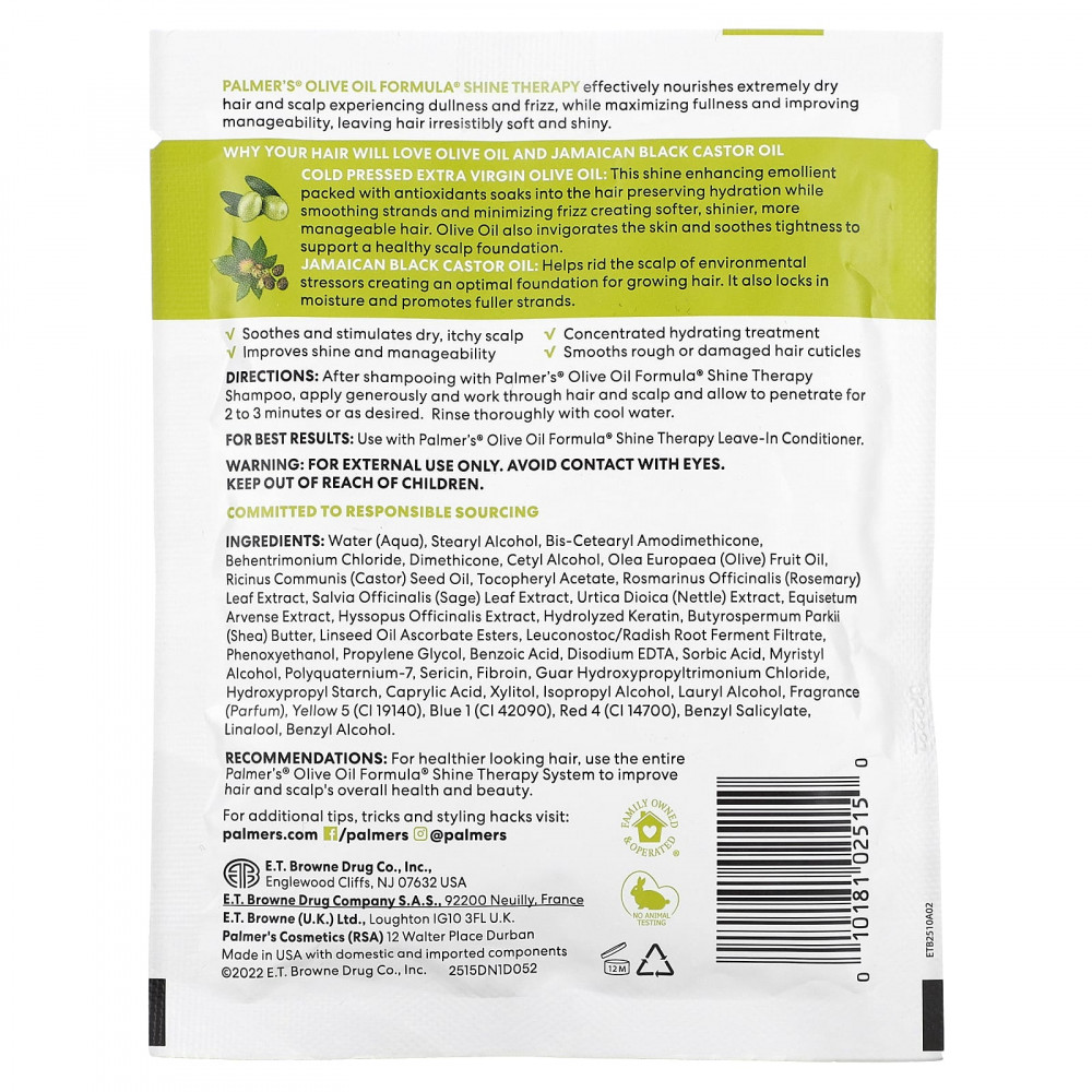 Olive Oil Formula® Shine Therapy от Palmer's® эффективно питает очень сухие волосы и кожу головы, которые испытывают тусклость и пушение, при этом максимизируя объем и улучшая послушность, делая волосы невероятно мягкими и блестящими.