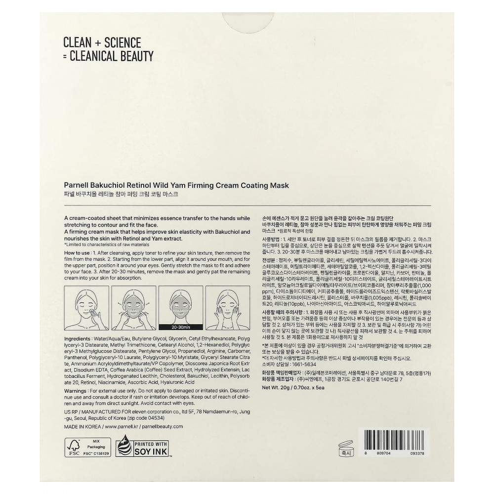 Тканевая маска с кремовой оболочкой сводит к минимуму попадание эссенции на руки и повторяет контуры лица. Укрепляющая крем-маска, которая помогает повысить эластичность кожи с помощью бакучиола и питает кожу с помощью ретинола и экстракта ямса.