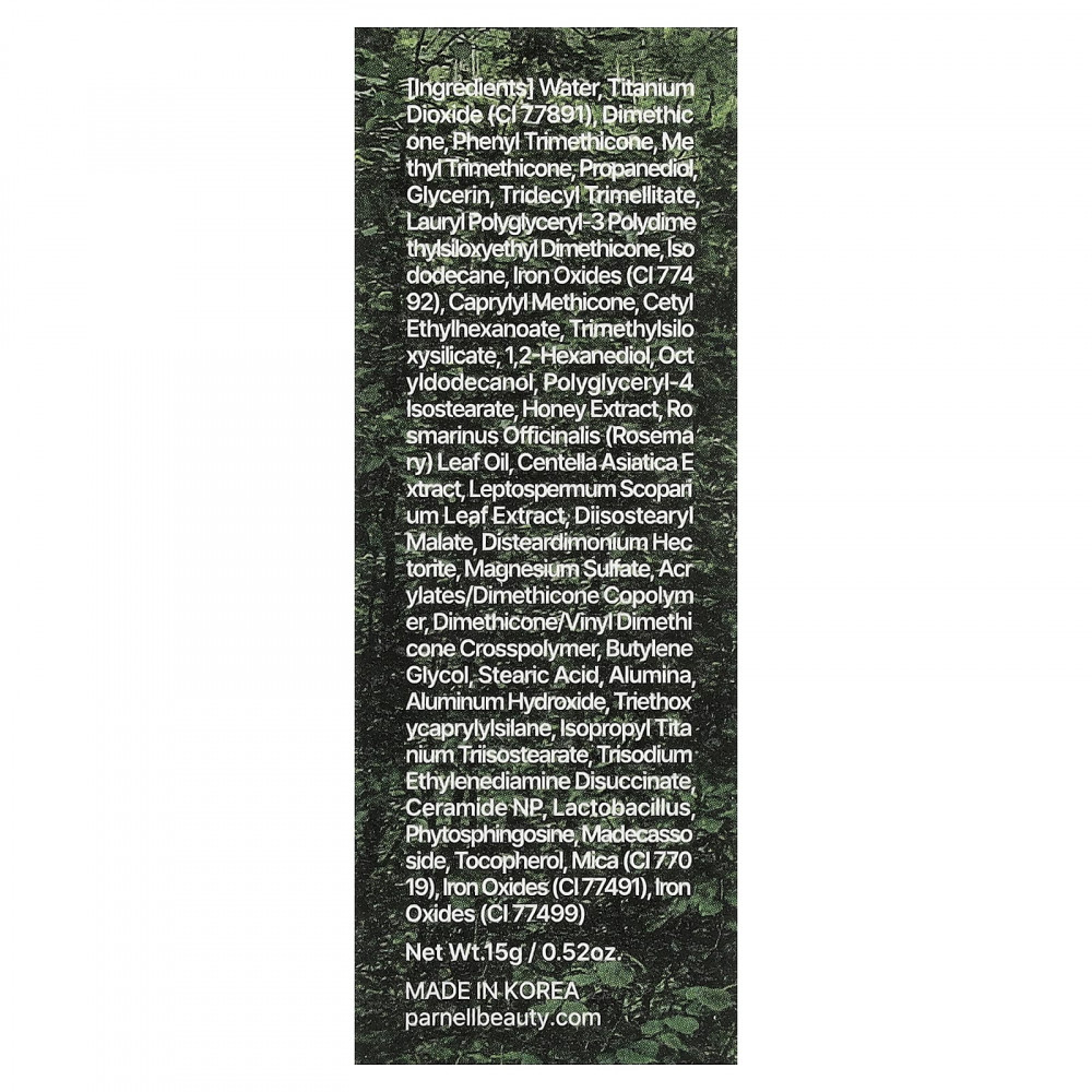 Вода, Диоксид титана (CI 77891), диметикон, фенилтриметикон, метилтриметикон, пропандиол, глицерин, тридецилтримеллитат, лаурилполиглицерил-3-полидиметилсилоксиэтилдиметикон, изододекан, оксиды железа (CI 774 92), каприлилметикон, цетилэтилгексаноат, триметилсилоксисиликат, 1,2-гександиол октилдодеканол, полиглицерил-4 изостеарат, экстракт меда, масло из листьев розмарина (Rosmarinus officinalis), Экстракт центеллы азиатской, экстракт листьев лопуха (Leptospermum scoparium), диизостеарил малат, Disteardimonium hectorite, сульфат магния, Сополимер акрилатов/диметикона, Кроссполимер диметикона/винилдиметикона, бутиленгликоль, стеариновая кислота, оксид алюминия, гидроксид алюминия, триэтоксикаприлилсилан, изопропиловый триизостеарат титана, тринатрий этилендиамин дисукцинат керамид NP, лактобактерии и фитосфингозин, Мадекассозид, Токоферол, слюда (CI 770 19), оксиды железа (CI 77491), оксиды железа (CI 77499).
