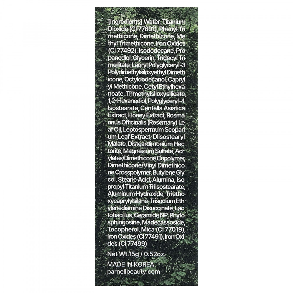 Вода, диоксид титана (CI 77891). фенилтриметикон, диметикон, метилтриметикон, оксиды железа (CI 77492), изододекан, пропандиол, глицерин, тридецил тримеллитат, лаурилполиглицерил-3-полидиметилсилоксиэтилдиметикон, октилдодеканол, каприлил метикон, цетилэтилгексаноат, триметилсилоксисиликат, 1,2-гександиол, полиглицерил-4 изостеарат, экстракт готу колы (Centella asiatica), экстракт меда, масло из листьев розмарина (Rosmarinus officinalis), экстракт листьев лептосперма (Leptospermum scoparium), диизостеарил малат, дистеардимония гекторит, сульфат магния, сополимер акрилатов / диметикона, диметикон/винил диметикон кроссполимер, бутиленгликоль, стеариновая кислота, оксид алюминия, изопропиловый триизостеарат титана, гидроксид алюминия, триэтоксикаприлилсилан, тринатрий этилендиамин дисукцинат лактобактерии, керамид NP, фитосфингозин, мадекассосид, токоферол, слюда (CI 77019), оксиды железа (CI 77491), оксиды железа (CI 77499).