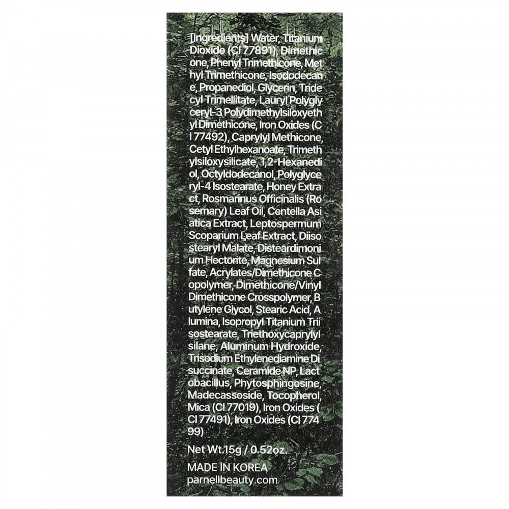 Вода, диоксид титана (CI 77891), диметикон фенил триметикон, метилтриметикон, изододекан, пропандиол, глицерин, тридецил тримеллитат, лаурилполиглицерил-3-полидиметилсилоксиэтилдиметикон, оксиды железа (c 177492), каприлил метикон, цетилэтилгексаноат, триметилсилоксисиликат, 1,2-гександиол, октилдодеканол, полиглицерил-4 изостеарат, экстракт меда, масло из листьев розмарина (Rosmarinus officinalis), экстракт готу колы (Centella asiatica), экстракт листьев лептосперма (Leptospermum scoparium), диизостеарил малат, дистеардимония гекторит, сульфат магния, сополимер акрилатов / диметикона, диметикон/винил диметикон кроссполимер, бутиленгликоль, стеариновая кислота, оксид алюминия, изопропиловый триизостеарат титана, триэтоксикаприлилсилан, гидроксид алюминия, тринатрия этилендиамин дисукцинат, керамид NP, бактерии Lactobacillus, фитосфингозин, мадекассосид, токоферол, слюда (CI 77019), оксиды железа (CI 77491), оксиды железа (CI 77499).