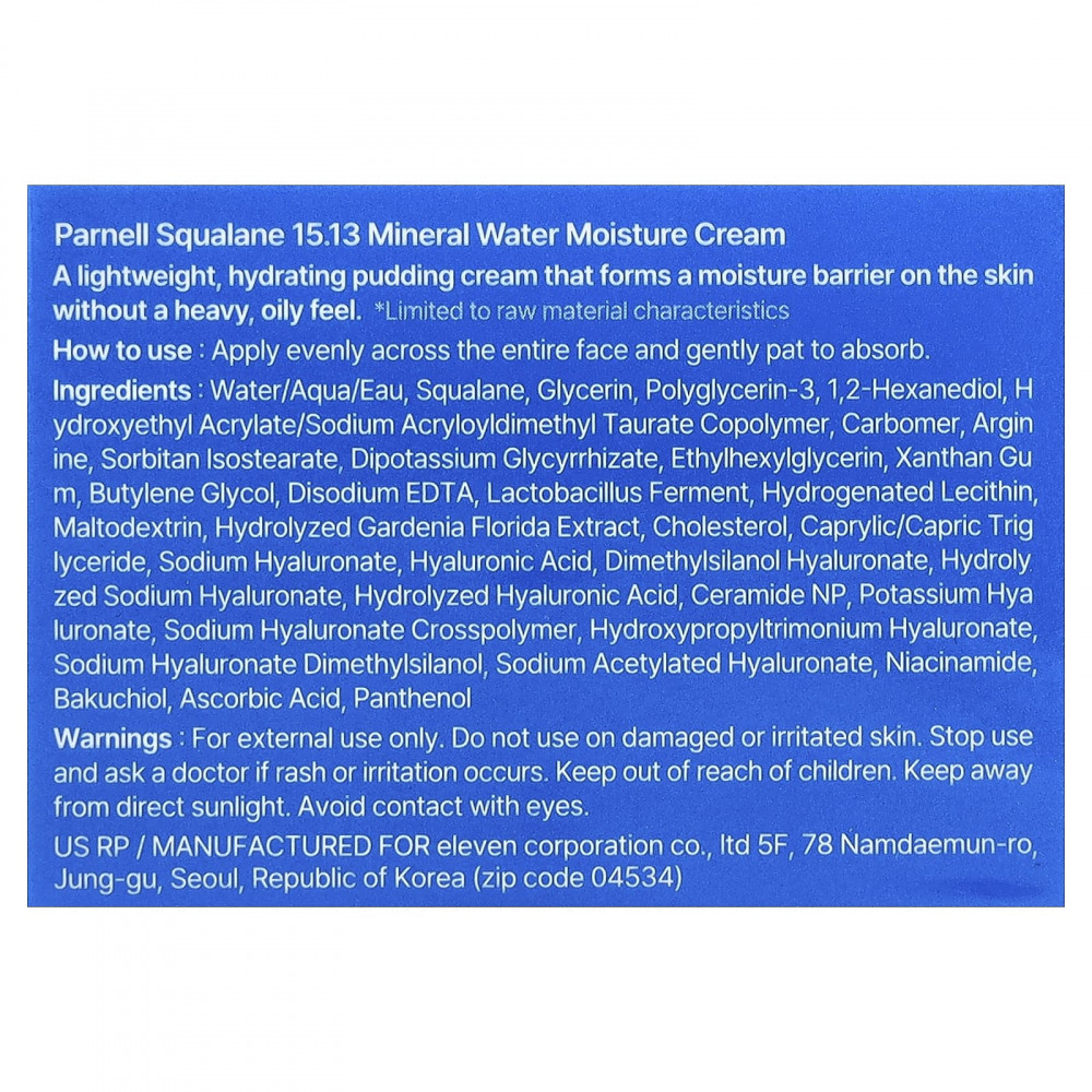 Вода, сквалан, глицерин, полиглицерин-3,1,2-гександиол, гидроксиэтил акрилат/натрия акрилоилдиметилтаурата сополимер, карбомер, аргинин, сорбитан изостеарат, дикалия глицирризат, этилгексилглицерин, ксантановая камедь, бутиленгликоль, двунатриевая ЭДТК, фермент лактобактерий (Lactobacillus), гидрогенизированный лецитин, мальтодекстрин, гидролизованный экстракт гардении жасминовидной (Gardenia florida), холестерина, каприловый/каприновый триглицерид, гиалуронат натрия, гиалуроновая кислота, диметилсиланол гиалуронат, гидролизованный гиалуронат натрия, гидролизованная гиалуроновая кислота, керамид NP, гиалуронат калия, кроссполимер гиалуроната натрия, гиалуронат гидроксипропилтримония, гиалуронат натрия диметилсиланол, ацетилированный гиалуронат натрия, никотинамид, бакучиол, аскорбиновая кислота, пантенол.