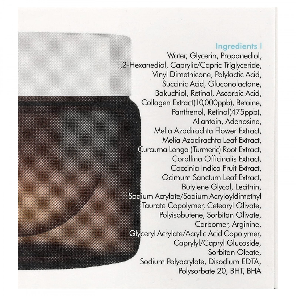 Вода, глицерин, пропандиол, 1,2-гександиол, каприловый/каприновый триглицерид, винил диметикон, полимолочная кислота, янтарная кислота, глюконолактон, бакучиол, ретиналь, аскорбиновая кислота, экстракт коллагена (10 000 част. / млрд), бетаин, пантенол, ретинол (475 част. / млрд), аллантоин, аденозин, экстракт цветков дерева ним (Melia azadirachta), экстракт листьев дерева ним (Melia azadirachta), экстракт корня куркумы (Curcuma longa), экстракт кораллины лекарственной (Corallina officinalis), экстракт плодов кокцинии индийской (Coccina indica), экстракт листьев туласи (Ocimum sanctum), бутиленгликоль, лецитин, натрий акрилат/натрий акрилоилдиметилтаурат сополимер, цетеарил оливат, полиизобутен, сорбитан оливат, карбомер, аргинин, сополимер глицерил акрилата/акриловой кислоты, каприлил/каприл глюкозид, сорбитанолеат, полиакрилат натрия, двунатриевая ЭДТК, полисорбат 20, бутилгидрокситолуол, бха.