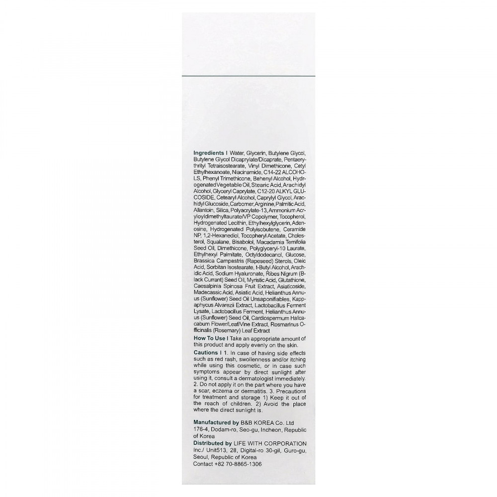 Вода, глицерин, бутиленгликоль, бутиленгликоль дикаприлат/дикапрат, пентаэритритил тетраизостеарат, винил диметикон, цетилэтилгексаноат, никотинамид, c14-22 спирты, фенилтриметикон, бегениловый спирт, гидрогенизированное растительное масло, стеариновая кислота, арахидиловый спирт, глицерил каприлат, c12-20 алкил глюкозид, цетеариловый спирт, каприлилгликоль, арахидиловый глюкозид, карбомер, аргинин, пальмитиновая кислота, аллантоин, диоксид кремния, полиакрилат-13, аммоний акрилоилдиметилтаурат/ВП сополимер, токоферол, гидрогенизированный лецитин, этилгексилглицерин, аденозин, гидрогенизированный полиизобутен, керамид NP, 1,2-гександиол, токоферилацетат, холестерина, сквалан, бисаболол, масло макадамии (Macadamia ternifolia), диметикон, полиглицерил-10 лаурат, этилгексил пальмитат, октилдодеканол, глюкоза, рапсовые стеролы (Brassica campestris), олеиновая кислота, сорбитан изостеарат, т-бутиловый спирт, арахиновая кислота, гиалуронат натрия, масло семян черной смородины (Ribes nigrum), миристиновая кислота, глутатион, экстракт плодов тары (Caesalpinia spinosa), азиатикозид, мадекассовая кислота, азиатиковая кислота, неомыляемые фракции подсолнечного масла (Helianthus annuus), экстракт каппафика альваресной (Kappaphycus alvarezii), лактобактерии ферментлизат, фермент лактобактерий (Lactobacillus), подсолнечное масло (Helianthus annuus), экстракт цветков/листьев/стеблей халикакаба (Cardiospermum halicacabum), экстракт листьев розмарина (Rosmarinus officinalis).