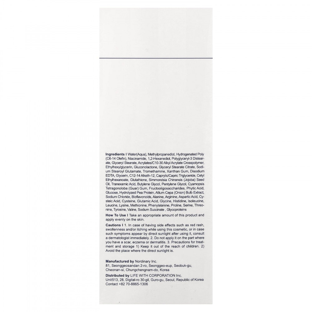 Вода (Aqua), метилпропандиол, гидрогенизированный поли (c6-14 олефин), никотинамид, 1,2-гександиол, полиглицерил-3 дистеарат, глицерил стеарат, акрилат/c10-30 алкил акрилат кроссполимер, этилгексилглицерин, глюконолактон, глицерил стеарат цитрат, натрия стеароил глутамат, трометамин, ксантановая камедь, двунатриевая ЭДТК, глицерин, c12-14 алкет-12, каприловый/каприновый триглицерид, цетилэтилгексаноат, глутатион, масло из семян жожоба (Simmondsia chinensis), транексамовая кислота, бутиленгликоль, пентилен гликоль, гуаровая камедь (Cyamopsis tetragonoloba), фруктоолигосахариды, фитиновая кислота, глюкоза, гидролизованный гороховый белок, экстракт луковицы репчатого (Allium cepa), хлорид натрия, биофлавоноиды, аланин, аргинин, аспарагиновая кислота, цистеиновая кислота, цистеин, глутаминовая кислота, глицин, гистидин, изолейцин, лейцин, лизин, метионина, фенилаланин, пролин, серин, треонин, тирозин, валин, сукцинат натрия, гликопротеины.