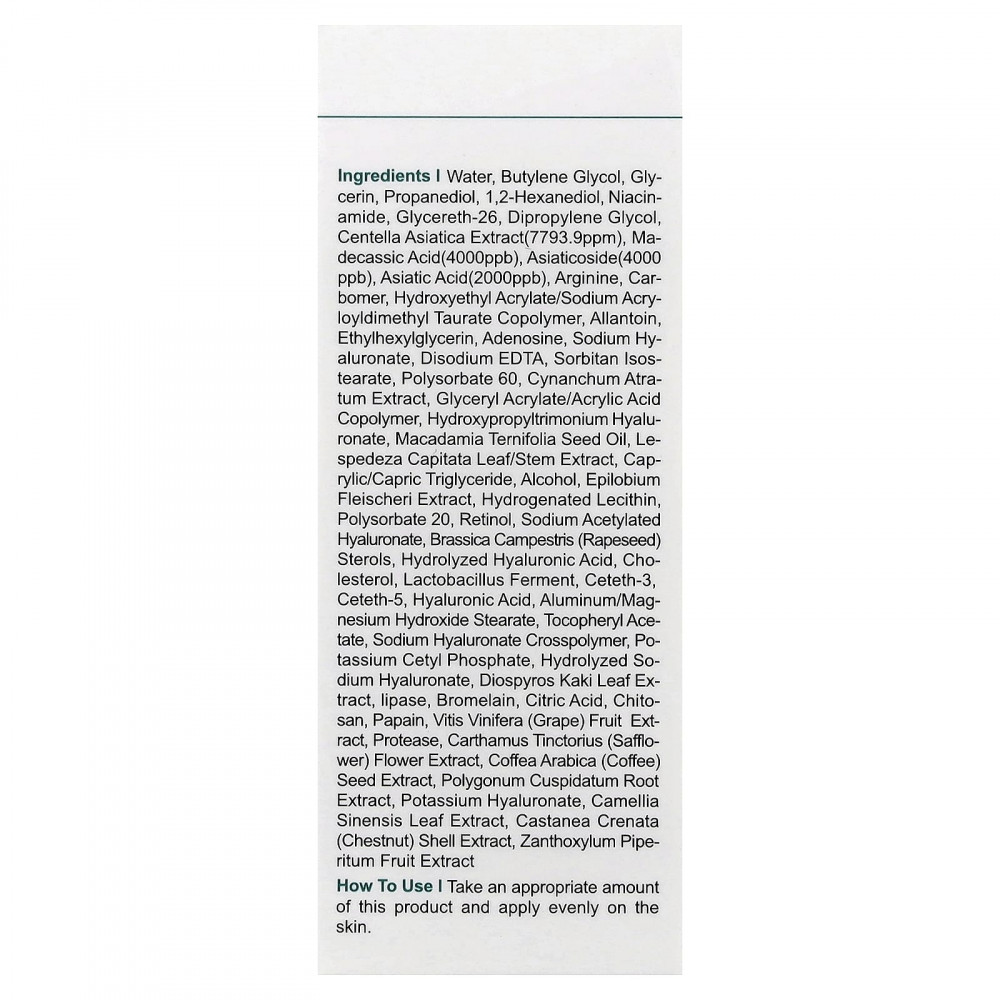 Вода, бутиленгликоль, глицерин, пропандиол, 1,2-гександиол, никотинамид, глицерет-26, дипропиленгликоль, экстракт готу колы (Centella asiatica) (7793,9 част./млн), мадекассовая кислота (4000 част./млрд), азиатикозид (4000 част./млрд), азиатиковая кислота (2000 част./млрд), аргинин, карбомер, гидроксиэтил акрилат/натрия акрилоилдиметилтаурата сополимер, аллантоин, этилгексилглицерин, аденозин, гиалуронат натрия, двунатриевая ЭДТК, сорбитан изостеарат, полисорбат 60, экстракт цинанхума (Cynanchum atratum), сополимер глицерил акрилата/акриловой кислоты, гиалуронат гидроксипропилтримония, масло макадамии (Macadamia ternifolia), экстракт листьев/стебля лесного гриба (Lespedeza capitata), каприловый/каприновый триглицерид, спирт, экстракт горянки (Epilobium floisheri), гидрогенизированный лецитин, полисорбат 20, ретинол, ацетилированный гиалуронат натрия, рапсовые стеролы (Brassica campestris), гидролизованная гиалуроновая кислота, холестерина, фермент лактобактерий (Lactobacillus), цетет-3, цетет-5, гиалуроновая кислота, стеарат гидроксида алюминия/магния, токоферилацетат, кроссполимер гиалуроната натрия, цетил фосфат калия, гидролизованный гиалуронат натрия, экстракт листьев хурмы восточной (Diospyros kaki), липаза, бромелаин, лимонная кислота, хитозан, папаин, экстракт плодов винограда (Vitis vinifera), протеаза, экстракт цветков сафлора (Carthamus tinctorius), экстракт зёрен кофе арабики (Coffea arabica), экстракт корня рейнутрии японской (Polygonum cuspidatum), гиалуронат калия, экстракт листьев зелёного чая (Camellia sinensis), экстракт скорлупы каштана (castanea crenata), экстракт сычуаньского перца (Zanthoxylum piperitum).