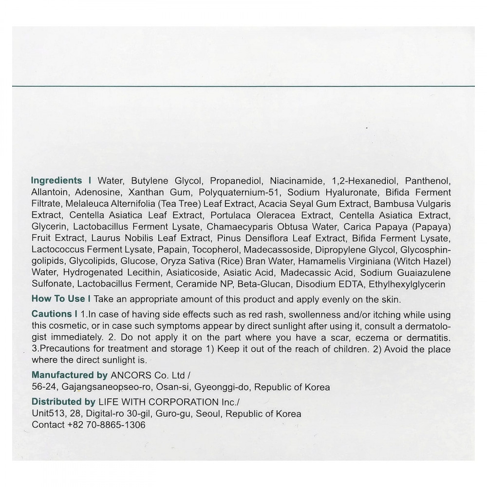 Вода, бутиленгликоль, пропандиол, никотинамид, 1,2-гександиол, пантенол, аллантоин, аденозин, ксантановая камедь, поликватерниум-51, гиалуронат натрия, фильтрат продукта ферментации бифидобактерий, экстракт листьев чайного дерева (Melaleuca alternifolia), экстракт камеди акации сеяльской (Acacia seyal), экстракт бамбука (Bambusa vulgaris), экстракт листьев готу колы (Centella asiatica), экстракт портулака огородного (Portulaca oleracea), экстракт готу колы (Centella asiatica), глицерин, лизат продукта ферментации лактобактерий, вода из кипарисовика (Chamaecyparis obtusa), экстракт плодов папайи (Carica papaya), экстракт листьев лаврака благородного, экстракт листьев сосны густоцветковой (Pinus densiflora), лизат ферментов бифидобактерий, лизат ферментов лактококка, папаин, токоферол, мадекассосид, дипропиленгликоль, гликосфинголипиды, гликолипиды, глюкоза, вода из рисовых отрубей (Oryza sativa), вода из гамамелиса (Hamamelis virginiana), гидрогенизированный лецитин, азиатикозид, азиатиковая кислота, мадекассовая кислота, гваязуленсульфонат натрия, фермент лактобактерий (Lactobacillus), керамид NP, бета-глюкан, двунатриевая ЭДТК, этилгексилглицерин.