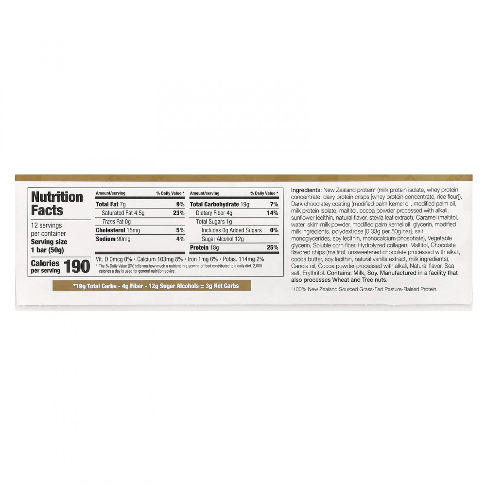 New zealand Protein ‡ (изолят молочного белка, концентрат сывороточного протеина, чипсы из молочного белка [концентрат сывороточного протеина, рисовая мука]), темная шоколадная глазурь (модифицированное пальмоядровое масло, модифицированное пальмовое масло, изолят молочного протеина, мальтит, какао-порошок, обработанный щелочью, подсолнечный лецитин, натуральный ароматизатор, экстракт листьев стевии), карамель (мальтит, вода, сухое обезжиренное молоко, модифицированное пальмоядровое масло, глицерин, модифицированные молочные ингредиенты, полидекстроза [0,33 г на 50 г батончика], соль, моноглицериды, соевый лецитин, монокальций фосфат), растительный глицерин, растворимая кукурузная клетчатка, гидролизованный коллаген, мальтит, чипсы со вкусом шоколада (мальтит, несладкий шоколад, обработанный щелочью, какао-масло, соевый лецитин, натуральный экстракт ванили, молочные ингредиенты), рапсовое масло, какао-порошок, обработанный щелочью, натуральный ароматизатор, морская соль, эритритол.