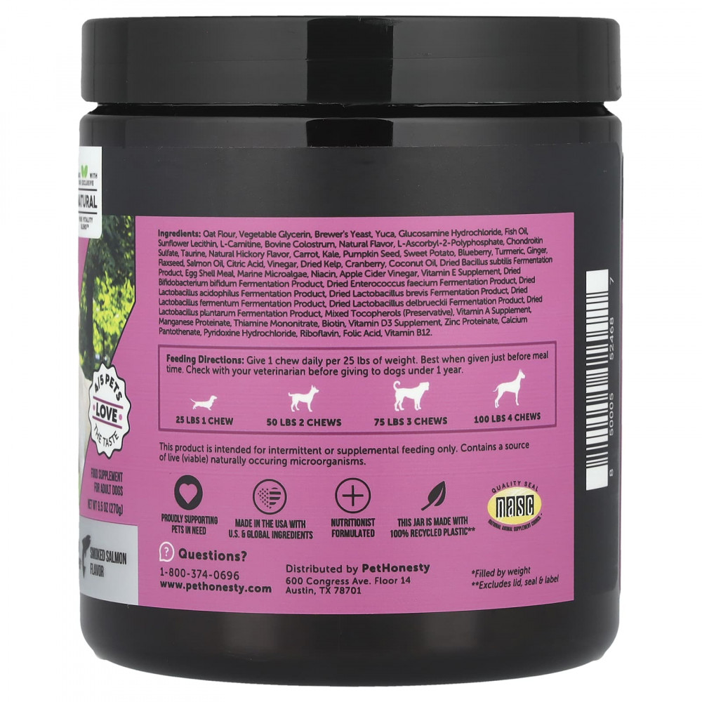 Овсяная мука, растительный глицерин, пивные дрожжи, юка, глюкозамина гидрохлорид, рыбий жир, подсолнечный лецитин, L-карнитин, бычье молозиво, натуральный ароматизатор, l-аскорбил-2-полифосфат, хондроитинсульфат, таурин, натуральный ароматизатор «Гикори», морковь, кудрявая капуста, тыквенное семя, батат, голубика, куркума, имбирь, льняное семя, жир лосося, лимонная кислота, уксус, сушеные водоросли, клюква, кокосовое масло, продукт ферментации сушеной палочки (Bacillus subtilis), мука из яичной скорлупы, морские микроводоросли, ниацин, яблочный уксус, добавка с витамином Е, сухой продукт ферментации бифидобактерии бифидум (Bifidobacterium bifidum), сухой продукт ферментации Enterococcus faecium, сухой продукт ферментации лактобактерий (Lactobacillus acidophilus), сухой продукт ферментации Lactobacillus brevis, сухой продукт ферментации лактобактерий (Lactobacillus fermentum), сухой продукт ферментации Lactobacillus delbrueckii, сухой продукт ферментации Lactobacillus plantarum, смешанные токоферолы (консервант), добавка с витамином А, протеинат марганца, тиамина мононитрат, биотин, добавка с витамином d3, протеинат цинка, пантотенат кальция, пиридоксина гидрохлорид, рибофлавин, фолиевая кислота, витамин B12.