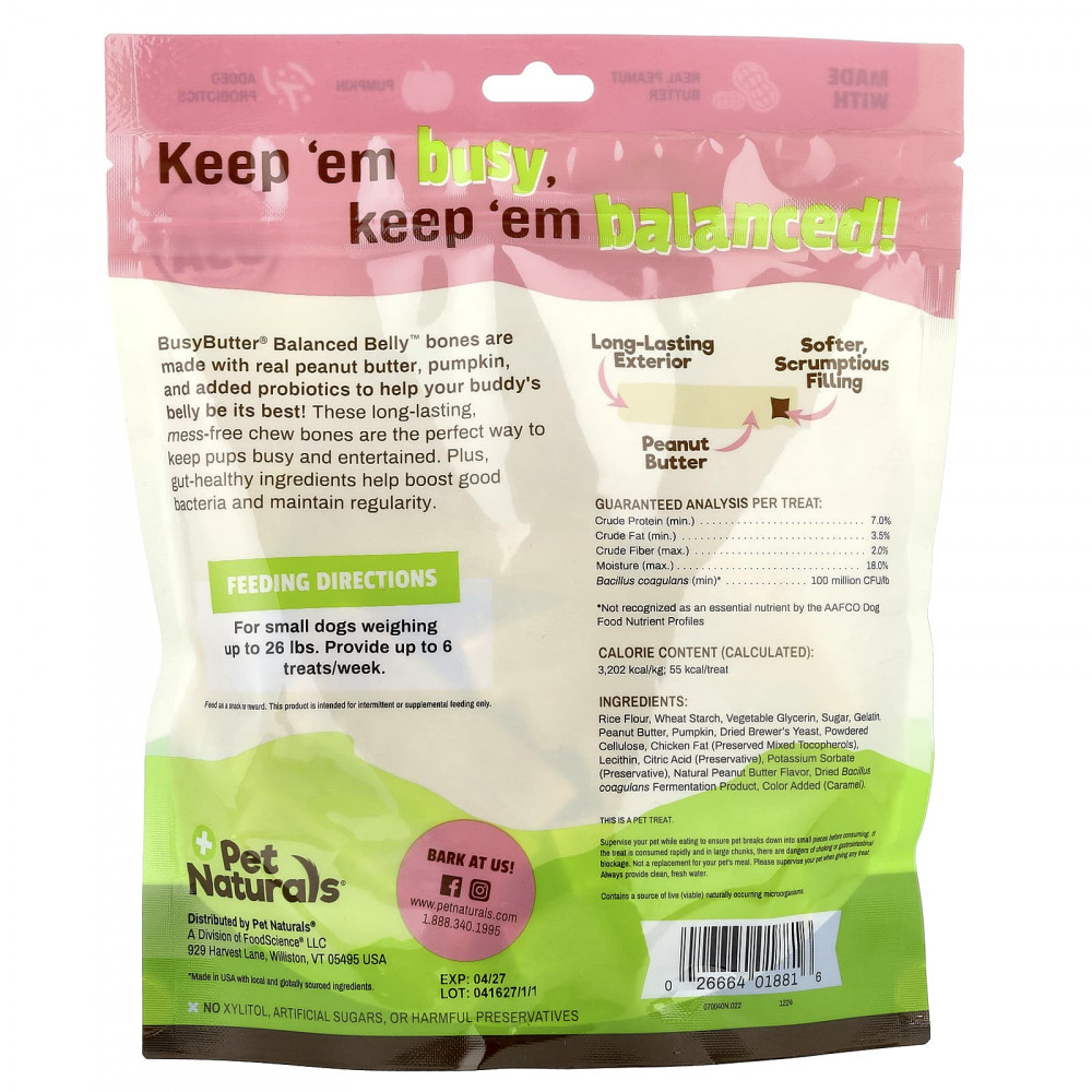 Кости BusyButter® Balanced Belly™ изготовлены из настоящей арахисовой пасты, тыквы и добавлены пробиотиков, чтобы помочь животу вашего друга быть в лучшем виде! Эти жевательные косточки на долгое время не загрязняются и являются идеальным способом занять и развлекать щенков. Кроме того, здоровые для кишечника ингредиенты помогают увеличить количество полезных бактерий и поддерживать регулярность стула.