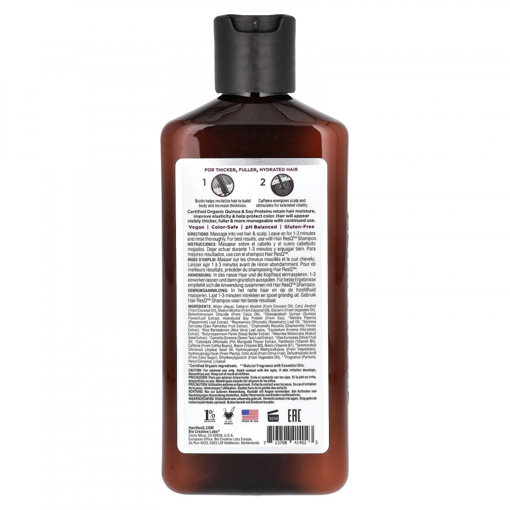 Вода, цетеариловый спирт (из кокосового масла), цетиловый спирт (из кокосового масла), стеариловый спирт (из кокосового масла), гексилглицерин (из растительного масла), бегентримония хлорид (из рапсового масла), экстракт цветков / листьев киноа (Chenopodium quinoa), гидролизованный соевый белок (из сои), экстракт листьев перечной мяты (Mentha piperita)*, масло из листьев розмарина (Rosmarinus officinalis)*, экстракт плодов серенои (Serenoa serrulata)*, экстракт цветков ромашки (Chamomilla recutita)*, сок листьев алоэ вера (Aloe barbadensis)*, экстракт хвоща полевого (Equisetum arvense)*, экстракт масла ши (Butyrospermum parkii)*, масло из семян орехов лумбанга (Aleurites moluccana)*, экстракт листьев зеленого чая (Camellia sinensis)*, оливковое масло (Olea europaea)*, экстракт цветков календулы (Pot marigold)*,, пантенол (витамин B5), кофеин (из кофейных зерен), ниацин (витамин B3), биотин (витамин B7), масло семян жожоба (Simmondsia chinensis)*, гидроксипропилметилцеллюлоза (из овощей), гидроксипропилгуар (из растений), лимонная кислота (из плодов цитрусовых), дегидроуксусная кислота (из тростникового сахара), этилгексилглицерин (из растительного масла), отдушка**, гексил циннамал, линалоол.