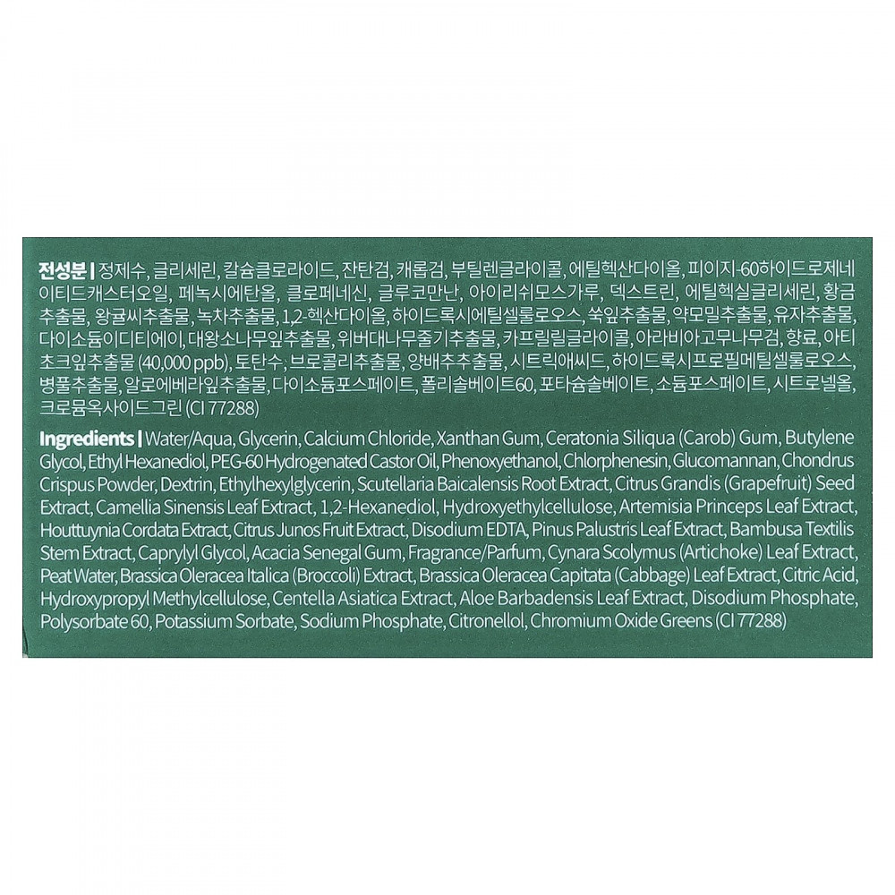 Вода (Aqua), глицерин, хлорид кальция, ксантановая камедь, камедь рожкового дерева (Ceratonia siliqua), бутиленгликоль, этил гександиол, ПЭГ-60 гидрогенизированное касторовое масло, феноксиэтанол, хлорфенезин, глюкоманнан, порошок из ирландского мха (Chondrus crispus), декстрин, этилгексилглицерин, экстракт корня шлемника (Scutellaria baicalensis), экстракт семян грейпфрута (Citrus grandis), экстракт листьев зелёного чая (Camellia sinensis), 1,2-гександиол, гидроксиэтилцеллюлоза, экстракт листьев полыни корейской (Artemisia princeps), экстракт хауттюйнии (Houttuynia cordata), экстракт плодов юдзу (Citrus junos), двунатриевая ЭДТК, экстракт хвои сосны болотной (Pinus palustris), экстракт стеблей бамбука (Bambusa textilis), каприлилгликоль, смола сенегальской акации (Acacia senegal), отдушка (парфюмерная композиция), экстракт листьев артишока (Cynara scolymus), торфяная вода, экстракт брокколи (Brassica oleracea italica), экстракт листьев капусты огородной (Brassica oleracea), лимонная кислота, гидроксипропилметилцеллюлоза, экстракт готу колы (Centella asiatica), экстракт листьев алоэ вера (Aloe barbadensis), динатрия фосфат, полисорбат 60, сорбат калия, фосфат натрия, цитронеллола, зелень с оксидом хрома (CI 77288).