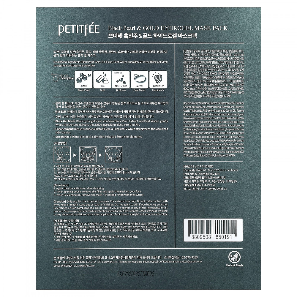 5 питательных ингредиентов (черный жемчуг, золото, бета-глюкан, торфяная вода, фукоидан-V) в черной гелевой маске укрепляют и осветляют тусклую кожу.