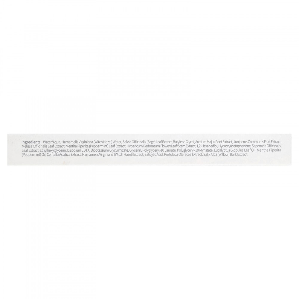 Вода, вода из гамамелиса (Hamamelis virginiana), экстракт листьев шалфея (Salvia officinalis), бутиленгликоль, экстракт корня аристотелии майской (Arctium majus), экстракт плодов можжевельника обыкновенного (Juniperus communis), экстракт листьев мелиссы лекарственной (Melissa officinalis), экстракт листьев перечной мяты (Mentha piperita), экстракт цветков, листьев и стеблей зверобоя (Hypericum perforatum), 1,2-гександиол, гидроксиацетофенон, экстракт листьев сапонарии лекарственной (Saponaria officinalis), этилгексилглицерин, двунатриевая ЭДТК, дикалия глицирризат, глицерин, полиглицерил-10 лаурат, полиглицерил-10 миристат, масло из листьев эвкалипта шаровидного (Eucalyptus globulus), масло перечной мяты (Mentha piperita), экстракт готу колы (Centella asiatica), экстракт гамамелиса (Hamamelis virginiana), салициловая кислота, экстракт портулака огородного (Portulaca oleracea), экстракт коры ивы белой (Salix alba).