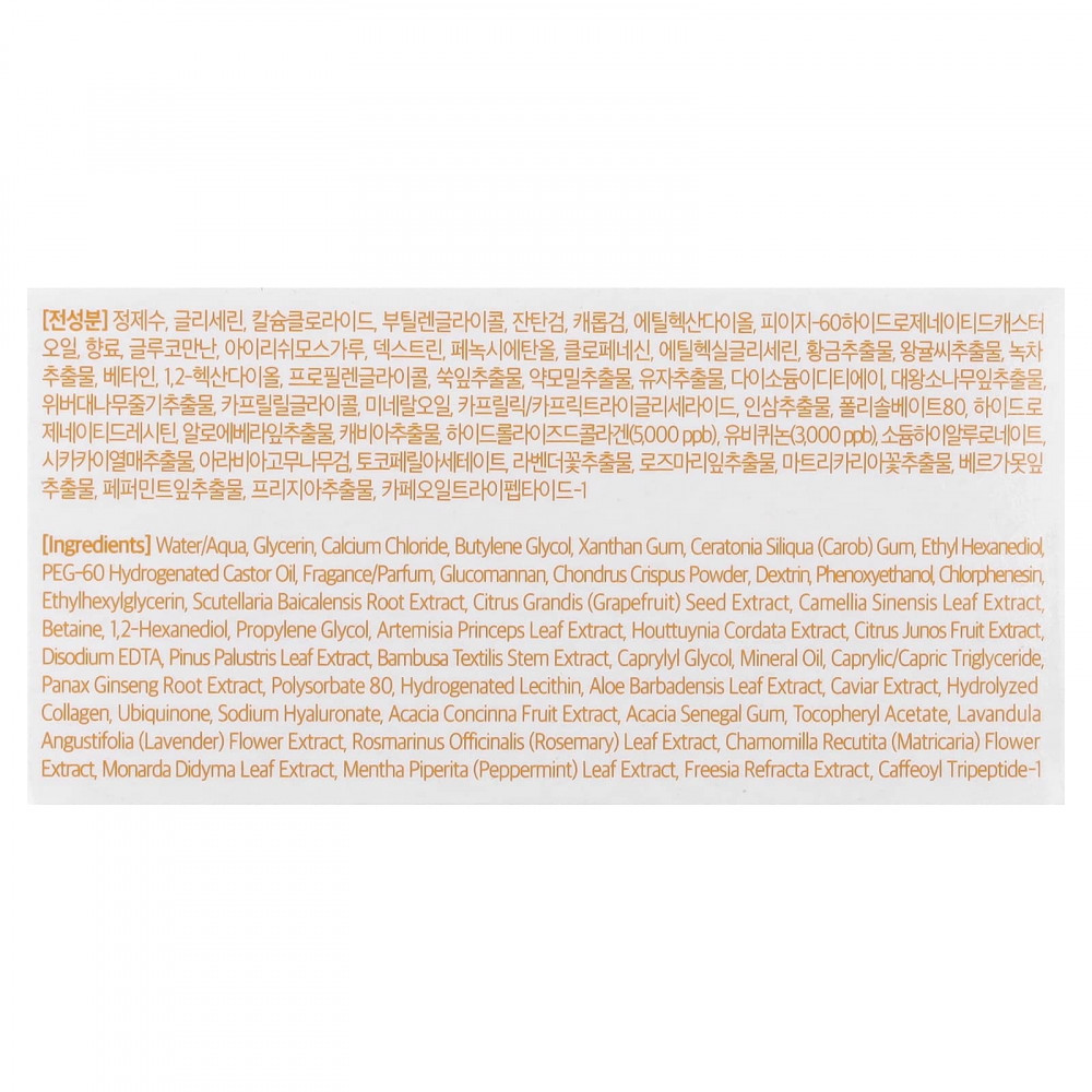 Вода, глицерин, хлорид кальция, бутиленгликоль, ксантановая камедь, камедь рожкового дерева (Ceratonia siliqua), этил гександиол, ПЭГ-60 гидрогенизированное касторовое масло, отдушка, глюкоманнан, порошок из ирландского мха (Chondrus crispus), декстрин, феноксиэтанол, хлорфенезин, этилгексилглицерин, экстракт корня шлемника (Scutellaria baicalensis), экстракт семян грейпфрута (Citrus grandis), экстракт листьев зелёного чая (Camellia sinensis), бетаин, 1,2-гександиол, пропиленгликоль, экстракт листьев полыни корейской (Artemisia princeps), экстракт хауттюйнии (Houttuynia cordata), экстракт плодов юдзу (Citrus junos), двунатриевая ЭДТК, экстракт хвои сосны болотной (Pinus palustris), экстракт стеблей бамбука (Bambusa textilis), каприлилгликоль, минеральное масло, каприловый/каприновый триглицерид, экстракт корня женьшеня (Panax ginseng), полисорбат 80, гидрогенизированный лецитин, экстракт листьев алоэ вера (Aloe barbadensis), экстракт черной икры, гидролизованный коллаген, убихинон, гиалуронат натрия, экстракт плодов акации концинной (Acacia concinna), смола сенегальской акации (Acacia senegal), токоферилацетат, экстракт цветков лаванды (Lavandula angustifolia), экстракт листьев розмарина (Rosmarinus officinalis), экстракт цветков ромашки лекарственной (Chamomilla recutita), экстракт листьев монарды двойчатой (Monarda didyma), экстракт листьев перечной мяты (Mentha piperita), экстракт фрезии (Feesia refracta), кофеоил трипептид-1.