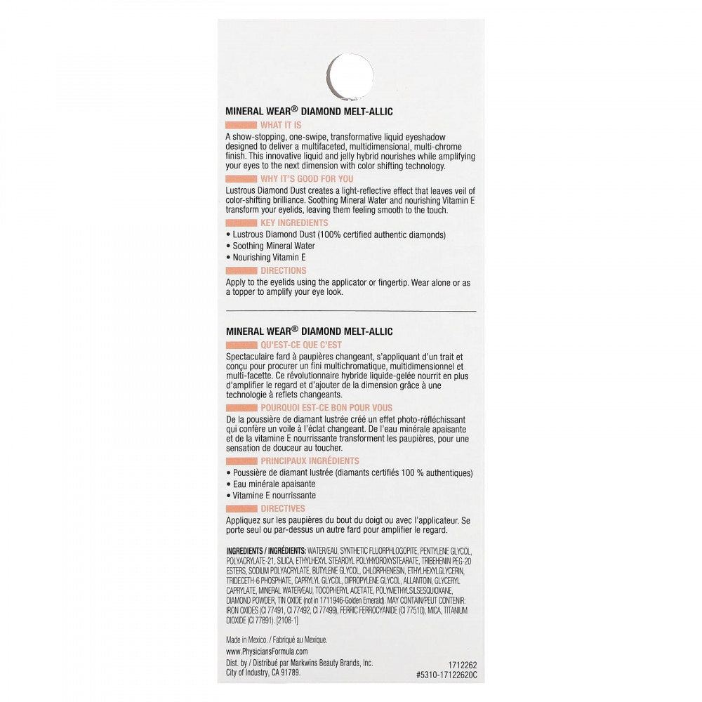Блестящая алмазная пыль создает светоотражающий эффект, который оставляет ощущение блеска, меняющего цвет. Успокаивающая минеральная вода и питательный витамин Е преображают ваши веки, делая их гладкими на ощупь.
