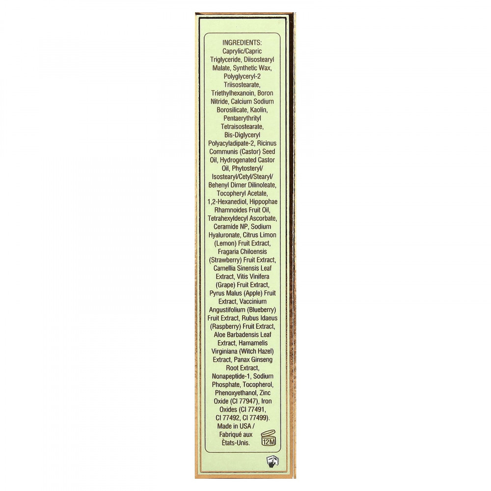 Каприловый/каприновый триглицерид, диизостеарил малат, синтетический воск, полиглицерил-2 триизостеарат, триэтилгексаноин, нитрид бора, кальций натрий боросиликат, каолин, пентаэритритил тетраизостеарат, бис-диглицерил полиациладипат-2, касторовое масло (Ricinus communis), гидрогенизированное касторовое масло, фитостерил/изостеарил/цетил/стеарил/бегенил димер дилинолеат, токоферилацетат, 1,2-гександиол, масло из плодов облепихи крушиновидной (Hippophae rhamnoides), тетрагексилдецил аскорбат, керамид NP, гиалуронат натрия, экстракт плодов лимона (Citrus limon), экстракт ягод клубники (Fragaria chiloensis), экстракт листьев зелёного чая (Camellia sinensis), экстракт плодов винограда (Vitis vinifera), экстракт яблока (Pyrus malus), экстракт ягод голубики (Vaccinium angustifolium), экстракт ягод малины (Rubus idaeus), экстракт листьев алоэ вера (Aloe barbadensis), экстракт гамамелиса (Hamamelis virginiana), экстракт корня женьшеня (Panax ginseng), нонапептид-1, фосфат натрия, токоферол, феноксиэтанол, оксид цинка (CI 77947), оксиды железа (CI 77491, CI 77492, CI 77499).