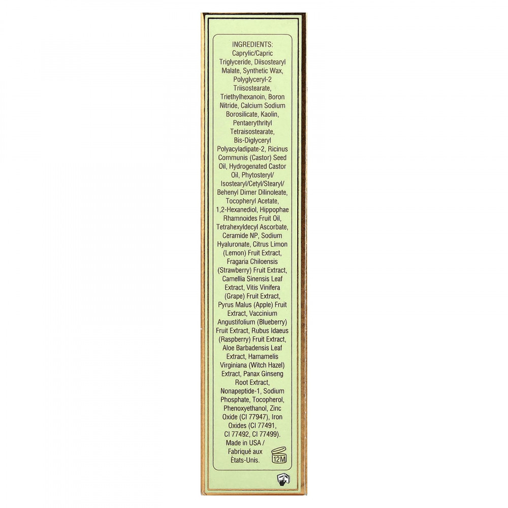 Каприловый/каприновый триглицерид, диизостеарил малат, синтетический воск, полиглицерил-2 триизостеарат, триэтилгексаноин, нитрид бора, кальций натрий боросиликат, каолин, пентаэритритил тетраизостеарат, бис-диглицерил полиациладипат-2, касторовое масло (Ricinus communis), гидрогенизированное касторовое масло, фитостерил/изостеарил/цетил/стеарил/бегенил димер дилинолеат, токоферилацетат, 1,2-гександиол, масло из плодов облепихи крушиновидной (Hippophae rhamnoides), тетрагексилдецил аскорбат, керамид NP, гиалуронат натрия, экстракт плодов лимона (Citrus limon), экстракт ягод клубники (Fragaria chiloensis), экстракт листьев зелёного чая (Camellia sinensis), экстракт плодов винограда (Vitis vinifera), экстракт яблока (Pyrus malus), экстракт ягод голубики (Vaccinium angustifolium), экстракт ягод малины (Rubus idaeus), экстракт листьев алоэ вера (Aloe barbadensis), экстракт гамамелиса (Hamamelis virginiana), экстракт корня женьшеня (Panax ginseng), нонапептид-1, фосфат натрия, токоферол, феноксиэтанол, оксид цинка (CI 77947), оксиды железа (CI 77491, CI 77492, CI 77499).