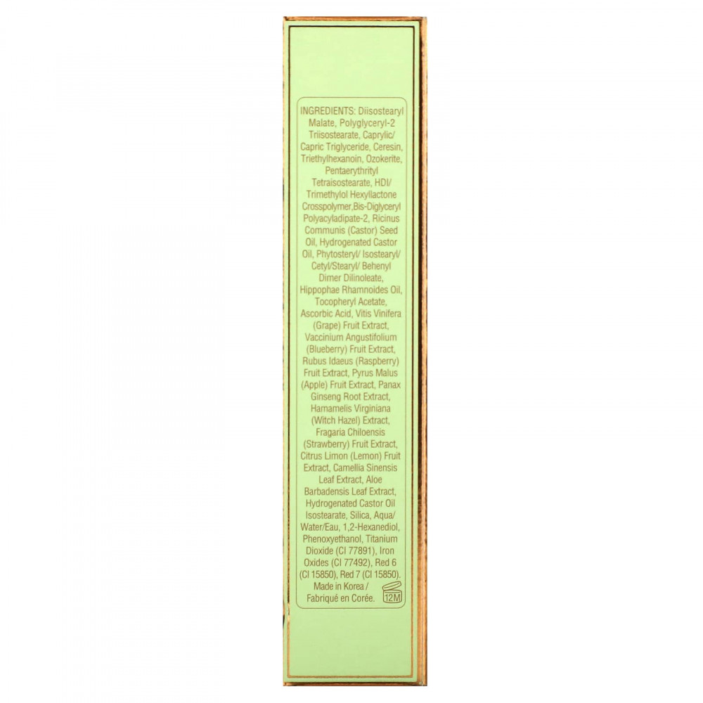 Диизостеарил малат, полиглицерил-2 триизостеарат, каприловый/каприновый триглицерид, церезин, триэтилгексаноин, озокерит, пентаэритритил тетраизостеарат, гександиизоцианат/триметилол хексиллактона кроссполимер, бис-диглицерил полиациладипат-2, касторовое масло (Ricinus communis), гидрогенизированное касторовое масло, фитостерил / изостеарил / цетил / стеарил / бегенил димер дилинолеат, масло облепихи крушиновидной (Hippophae rhamnoides), токоферилацетат, аскорбиновая кислота, экстракт плодов винограда (Vitis vinifera), экстракт ягод голубики (Vaccinium angustifolium), экстракт ягод малины (Rubus idaeus), экстракт яблока (Pyrus malus), экстракт корня женьшеня (Panax ginseng), экстракт гамамелиса (Hamamelis virginiana), экстракт ягод клубники (Fragaria chiloensis), экстракт плодов лимона (Citrus limon), экстракт листьев зелёного чая (Camellia sinensis), экстракт листьев алоэ вера (Aloe barbadensis), изостеарат гидрогенизированного касторового масла, диоксид кремния, вода (Aqua), 1,2-гександиол, феноксиэтанол, диоксид титана (CI 77891), оксиды железа (CI 77492), краситель красный 6 (CI 15850), краситель красный 7 (CI 15850).