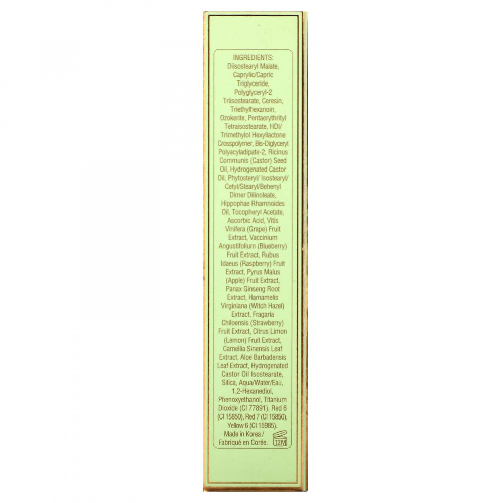 Диизостеарил малат, каприловый/каприновый триглицерид, полиглицерил-2 триизостеарат, церезин, триэтилгексаноин, озокерит, пентаэритритил тетраизостеарат, гександиизоцианат/триметилол хексиллактона кроссполимер, бис-диглицерил полиациладипат-2, касторовое масло (Ricinus communis), гидрогенизированное касторовое масло, фитостерил/изостеарил/цетил/стеарил/бегенил димер дилинолеат, масло облепихи крушиновидной (Hippophae rhamnoides), токоферилацетат, аскорбиновая кислота, экстракт плодов винограда (Vitis vinifera), экстракт ягод голубики (Vaccinium angustifolium), экстракт ягод малины (Rubus idaeus), экстракт яблока (Pyrus malus), экстракт корня женьшеня (Panax ginseng), экстракт гамамелиса (Hamamelis virginiana), экстракт ягод клубники (Fragaria chiloensis), экстракт плодов лимона (Citrus limon), экстракт листьев зеленого чая (Camellia sinensis), экстракт листьев алоэ вера (Aloe barbadensis), изостеарат гидрогенизированного касторового масла, диоксид кремния, вода/вода, 1,2-гександиол, феноксиэтанол, диоксид титана (CI 77891), краситель красный 6 (CI 15850), краситель красный 7 (CI 15850), краситель желтый 6 (CI 15985).