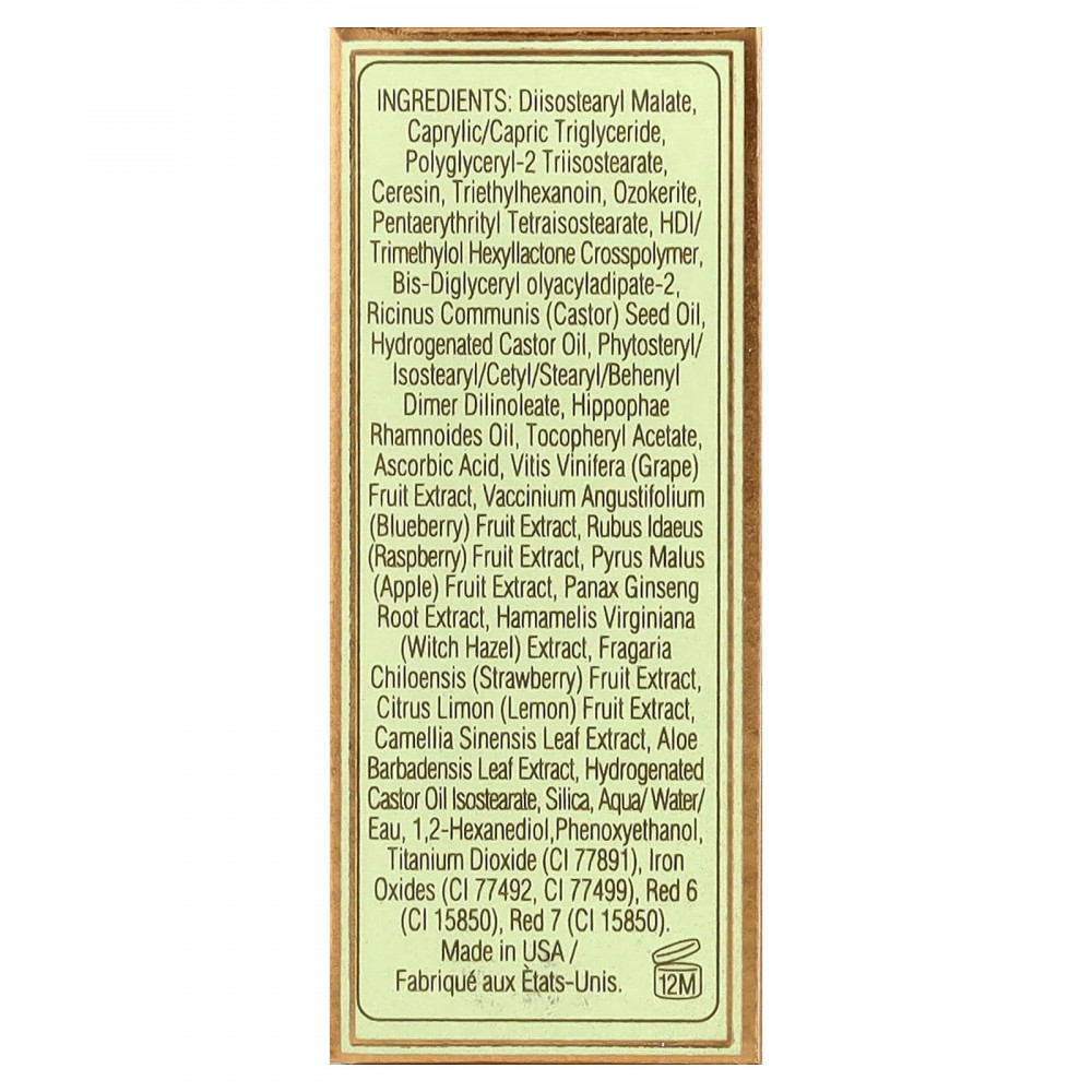 Диизостеарил малат, каприловый/каприновый триглицерид, полиглицерил-2 триизостеарат, церезин, триэтилгексаноин, озокерит, пентаэритритил тетраизостеарат, гександиизоцианат/триметилол хексиллактона кроссполимер, бис-диглицерил олиациладипат-2, касторовое масло (Ricinus communis), гидрогенизированное касторовое масло, фитостерил/изостеарил/цетил/стеарил/бегенил димер дилинолеат, масло облепихи крушиновидной (Hippophae rhamnoides), токоферилацетат, аскорбиновая кислота, экстракт плодов винограда (Vitis vinifera), экстракт ягод голубики (Vaccinium angustifolium), экстракт ягод малины (Rubus idaeus), экстракт яблока (Pyrus malus), экстракт корня женьшеня (Panax ginseng), экстракт гамамелиса (Hamamelis virginiana), экстракт ягод клубники (Fragaria chiloensis), экстракт плодов лимона (Citrus limon), экстракт листьев зелёного чая (Camellia sinensis), экстракт листьев алоэ вера (Aloe barbadensis), изостеарат гидрогенизированного касторового масла, диоксид кремния, вода/eau, 1,2-гександиол, феноксиэтанол, диоксид титана (CI 77891), оксиды железа (CI 77492, CI 77499), краситель красный 6 (CI 15850), краситель красный 7 (CI 15850).